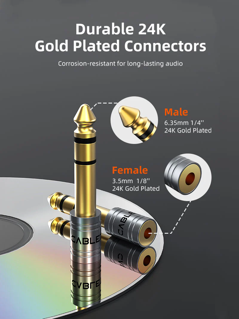 От 6,35 мм от 1/4 мужчин до 3,5 мм 1/8 женского стереоадаптера для наушников позволяет музыкантам и энтузиастам звука легко соединять свое профессиональное аудиоустроение, такое как гитары, клавишные и усилители, к повседневным устройствам, таким как смартфоны, планшеты или ноутбуки.