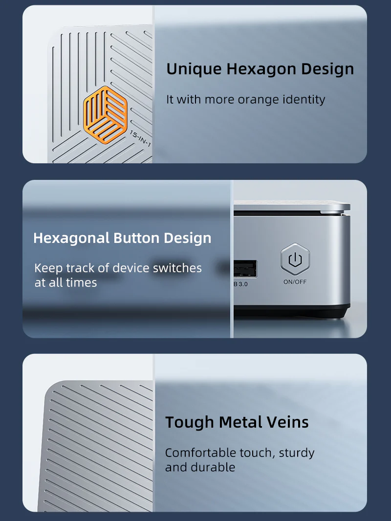 Ознакомьтесь с прохладной шестиугольной формой нашей док-станции Type-C с ярко-оранжевыми деталями. Конструкция шестиугольной кнопки помогает постоянно отслеживать переключатели устройства. Кроме того, он изготовлен из прочного металла, поэтому он хорошо себя чувствует и держится.