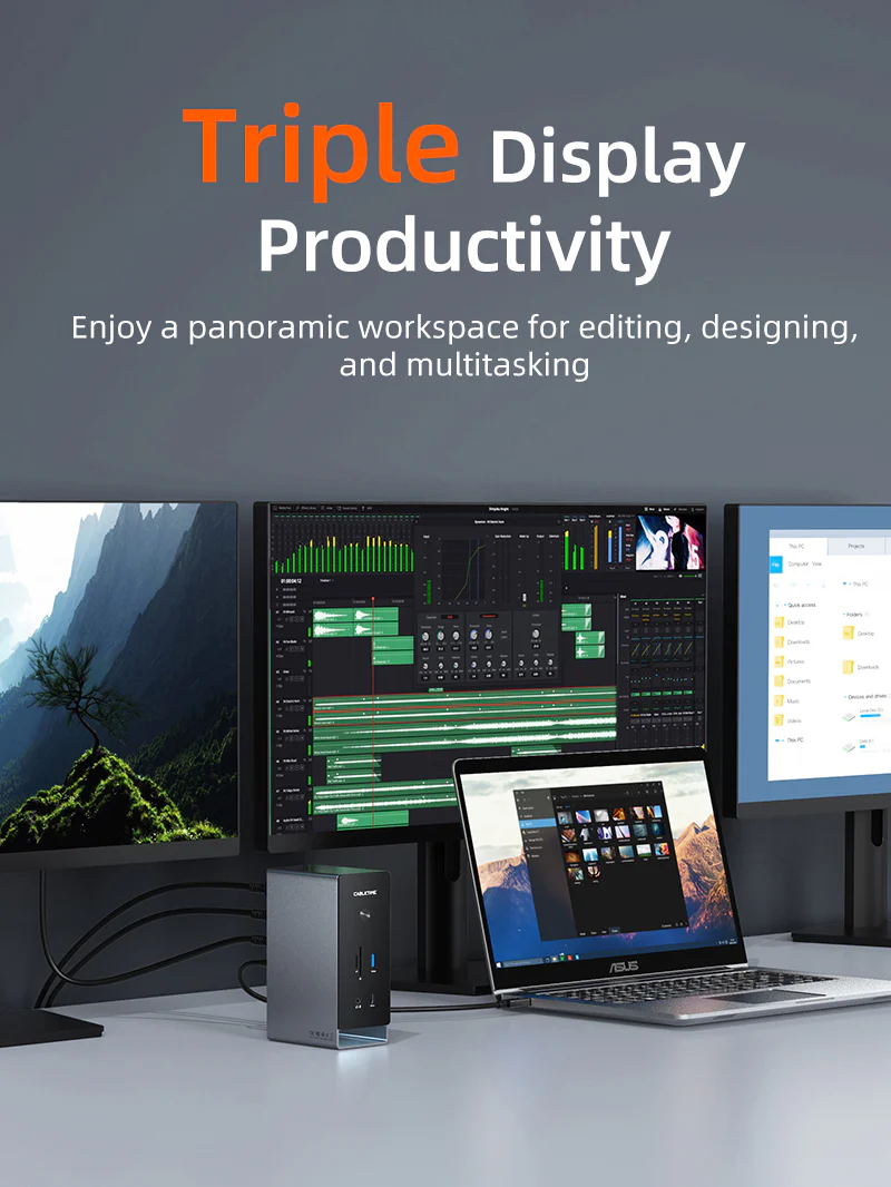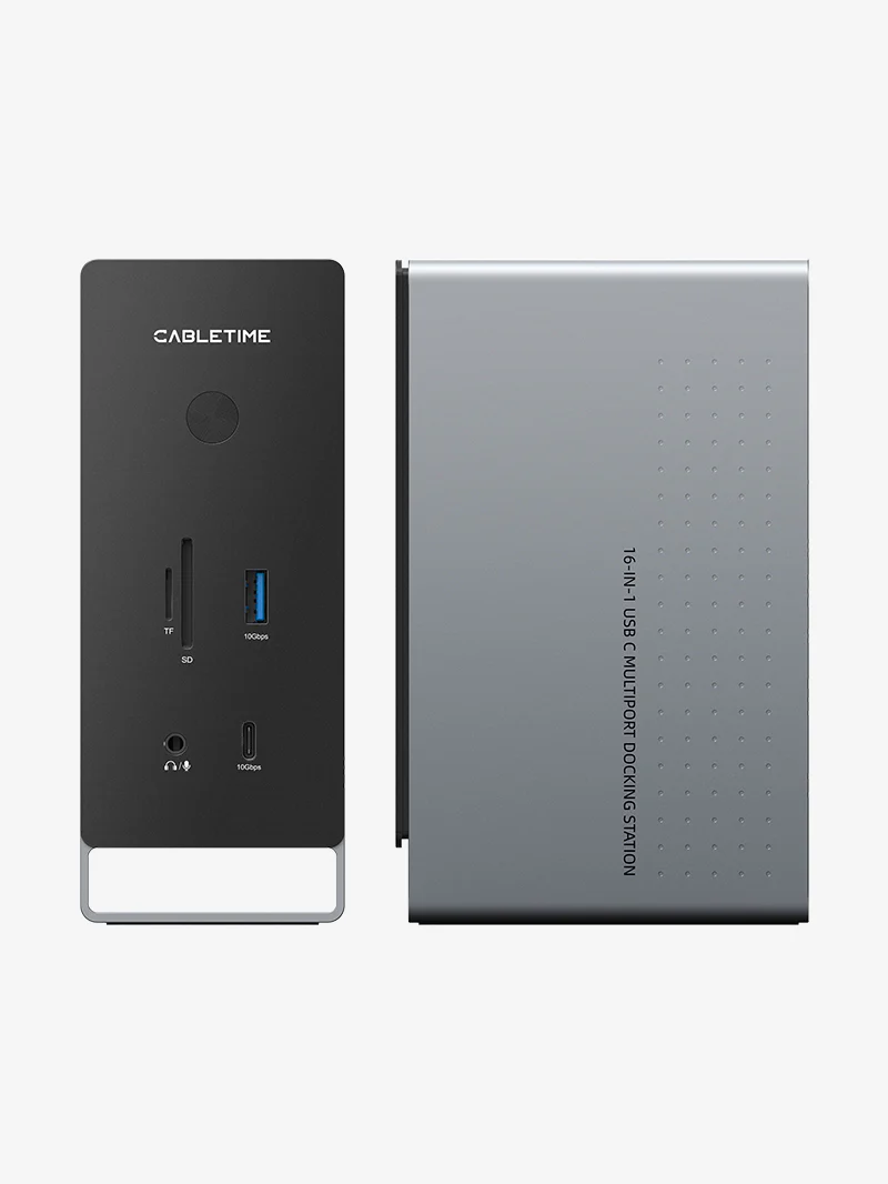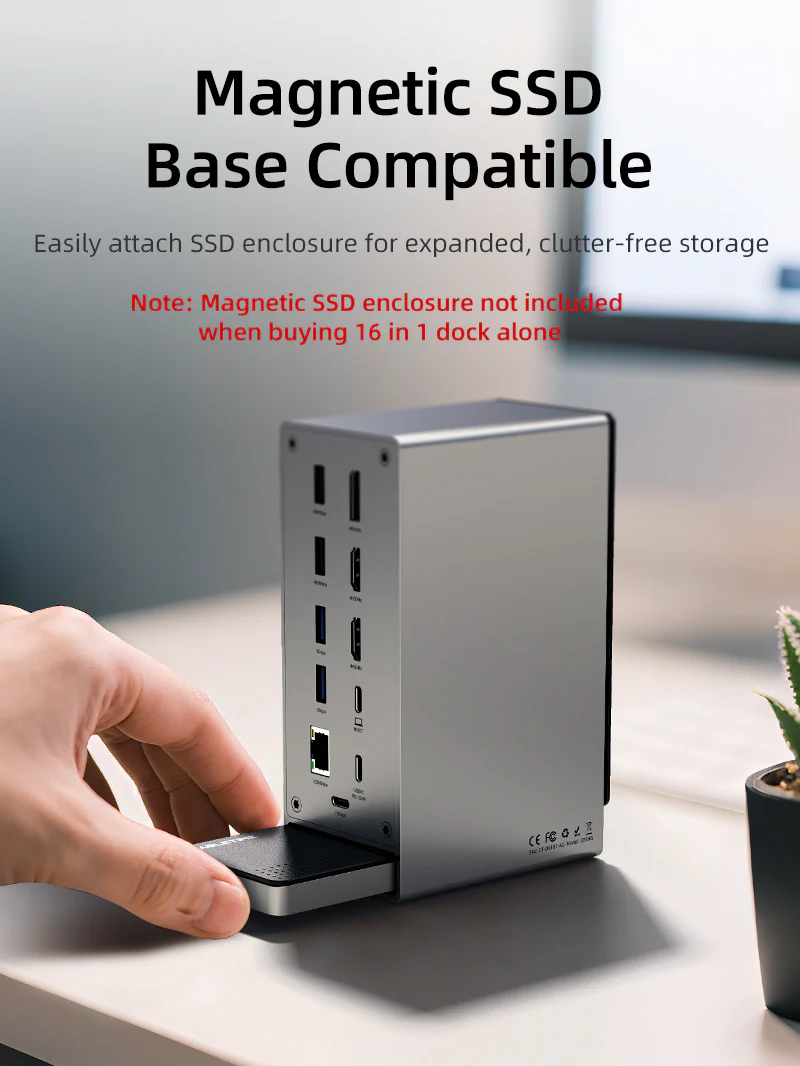 Расширение SSD без лишних хлопот: Подключите док-станцию для ноутбука к магнитному корпусу для SSD-накопителя Cabletime и аккуратно вставьте его в интегрированную базу — никаких торчащих кабелей, никакой путаницы в установке. Это идеальный способ расширить хранилище, сохраняя при этом чистоту, современный вид и полную оптимизацию рабочего пространства. (Магнитный корпус для SSD-накопителя продается отдельно.)