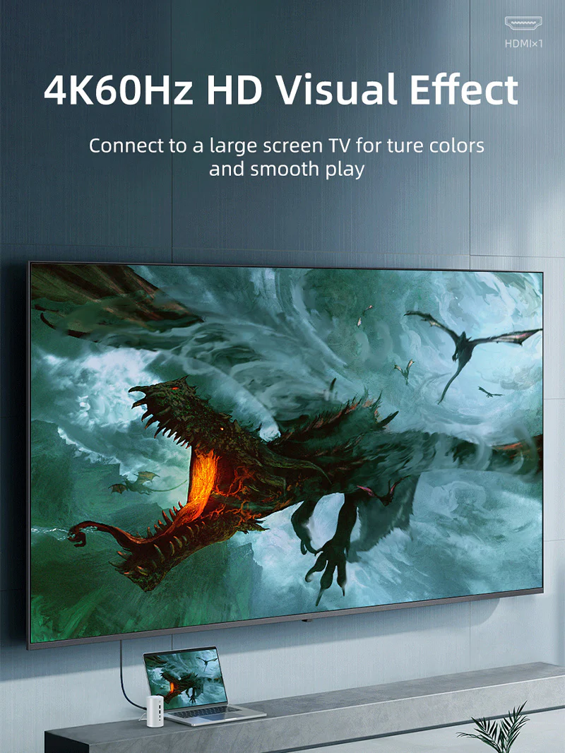 Эта док-станция для ноутбука поддерживает 4K при 60 Гц и 1080P при 120 Гц. Это очень простой способ подключить ноутбук к телевизору высокой четкости, монитору или проектору через порт HDMI док-станции USB типа C. Вы получите сверхчеткое и яркое видео с четкой видимостью каждого кадра и каждой сцены. Почувствуйте каждое изменение частоты кадров и подарите больше волнения.