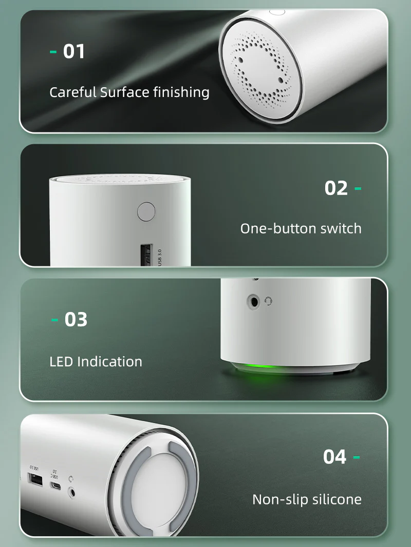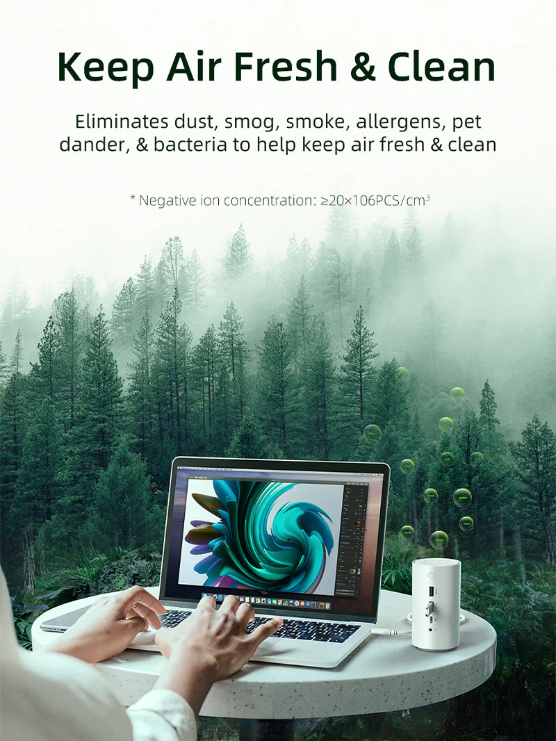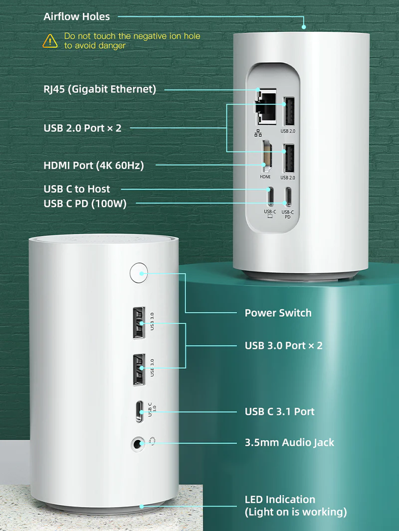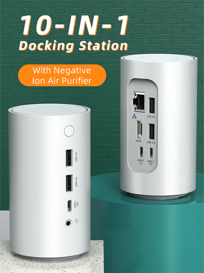 Док-станция USBC имеет функцию очистки воздуха с отрицательными ионами, которая устраняет пыль, дым, пары, аллергены, перхоть домашних животных и бактерии, помогая сохранять воздух свежим.