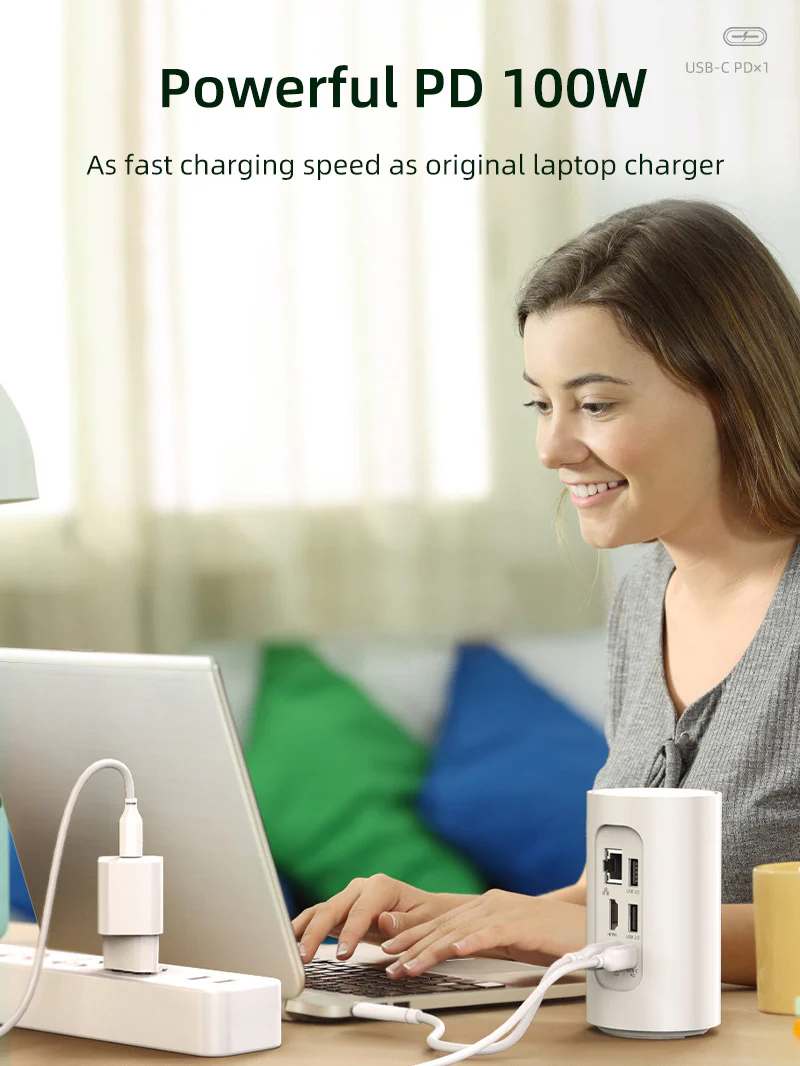 Портативная док-станция поддерживает передачу мощности 100 Вт, до 5 А, что позволяет быстро заряжать и сокращать время зарядки.