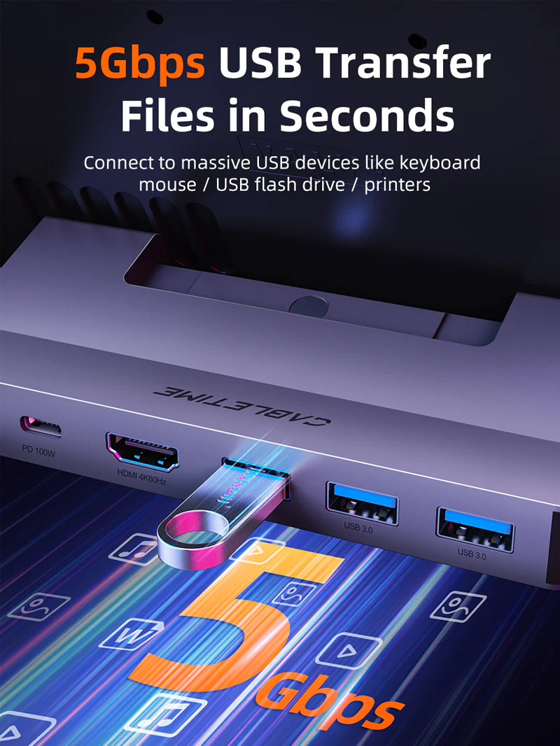 Благодаря трем портам USB-A, поддерживающим быструю передачу данных 5 Гбит/с, паровая док-станция Cabletime USB c ускоряет передачу данных. Легко подключайте широкий спектр USB-устройств, включая клавиатуры, мыши, флэш-накопители, жесткие диски и многое другое, для быстрого перемещения данных и бесперебойного взаимодействия с устройствами. Благодаря скорости 5 Гбит/с передача файлов и синхронизация устройств становятся быстрее и эффективнее, улучшая ваши игровые и вычислительные возможности.