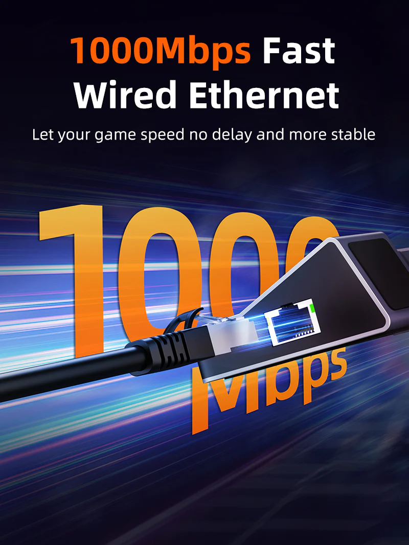 Ethernet-порт Steam Dock обеспечивает невероятно быстрое соединение 1000 Мбит/с, гарантируя, что ваши игры всегда будут стабильными и быстрыми. Загрузите ли новые игры или играете онлайн, испытаете минимальное отставание и максимальную производительность.