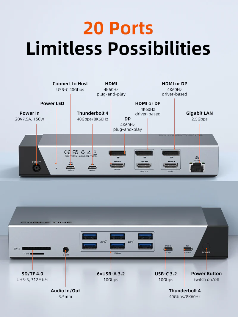 Многофункциональный USB-C концентратор 10-в-1 от Cabletime расширит возможности современного ультрабука, добавив ему недостающих из-за своего тонкого корпуса возможностей. Концентратор позволяет подключить к ноутбуку дополнительную периферию, съемный накопитель или карту памяти, вывести изображение на большой экран или подключить интернет через кабель.