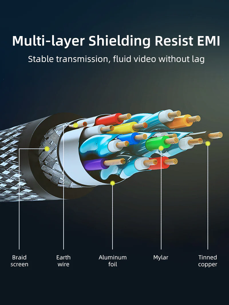 Кабель Ultra HD HDMI 2.0 совместим с ноутбуками, компьютерами, игровыми приставками, телевизорами и другими устройствами с поддержкой HDMI, поэтому вы можете наслаждаться кристально чистым изображением на больших телевизорах/мониторах 4K UHD. Позолоченные разъемы 24K делают кабель устойчивым к коррозии и долговечным, а многослойная экранирующая медная жила устойчива к электромагнитным помехам и обеспечивает стабильный выходной сигнал. Между тем, он поддерживает 3D, канал Ethernet, обратный аудиоканал, 1080p, разрешение Full HD, Dolby True HD и DTS-HD Master Audio.