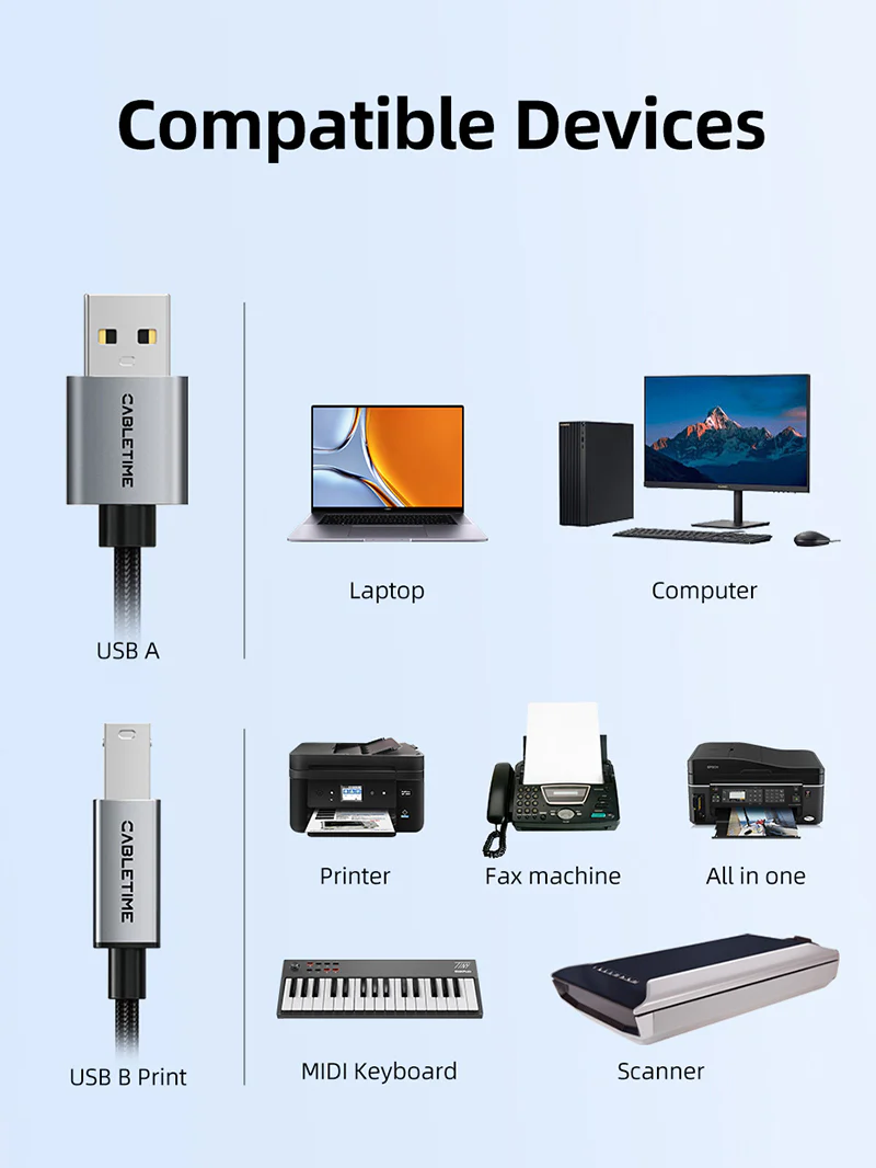 Кабель принтера типа C CableTime предназначен для легкости подключения устройств USB Type-C к широкому диапазону периферийных устройств USB B 2.0. Будь то принтер, сканер, выключатель принтера, внешний жесткий диск или аудиооборудование, такое как цифровое пианино Yamaha Casio, MIDI -контроллер или электрическая клавиатура, этот кабель обеспечивает бесшовную совместимость и надежные соединения без каких -либо проблем.