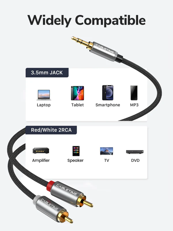 Просто подключите 3,5-мм аудиоразъем к ноутбуку, телефону или другому устройству, а 2 разъема RCA подключите к звуковой системе. Не требует драйверов, прост в использовании.
