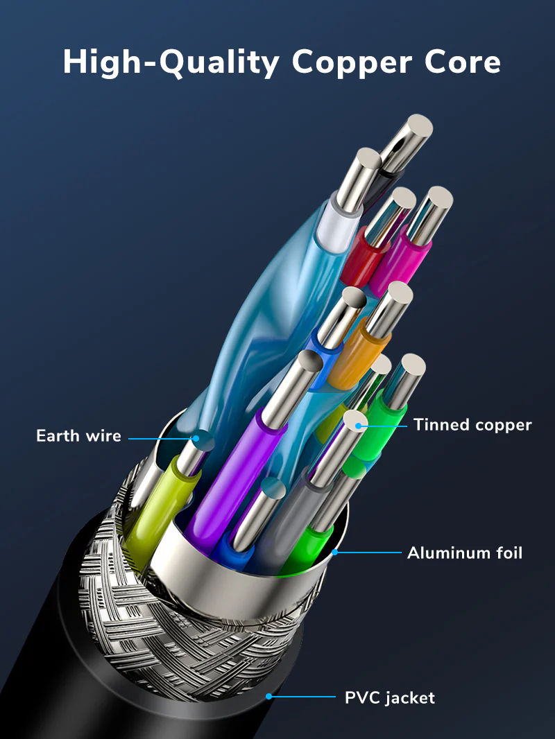 Куртка TPE обладает отличной гибкостью и сопротивлением растяжению, ее нелегко сломать, чтобы предотвратить повторный изгиб, вызванный поломкой. Высококачественные разъемы с позолотой 24К и многослойное экранирование обеспечивают максимальную производительность кабеля.