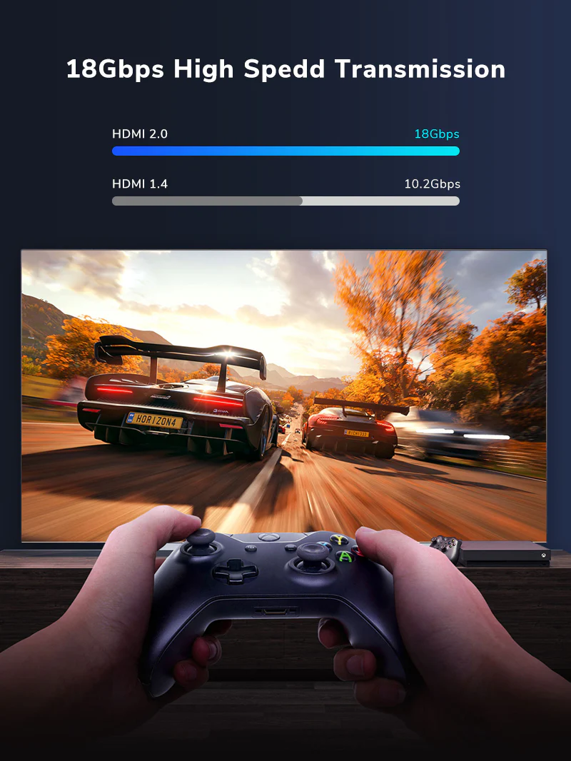 Кабели HDMI 2.0 обеспечивают пропускную способность до 18 Гбит/с, обеспечивая более быструю и плавную передачу аудио, видео и фотографий без ожидания буферизации, предназначенные для энтузиастов игр.