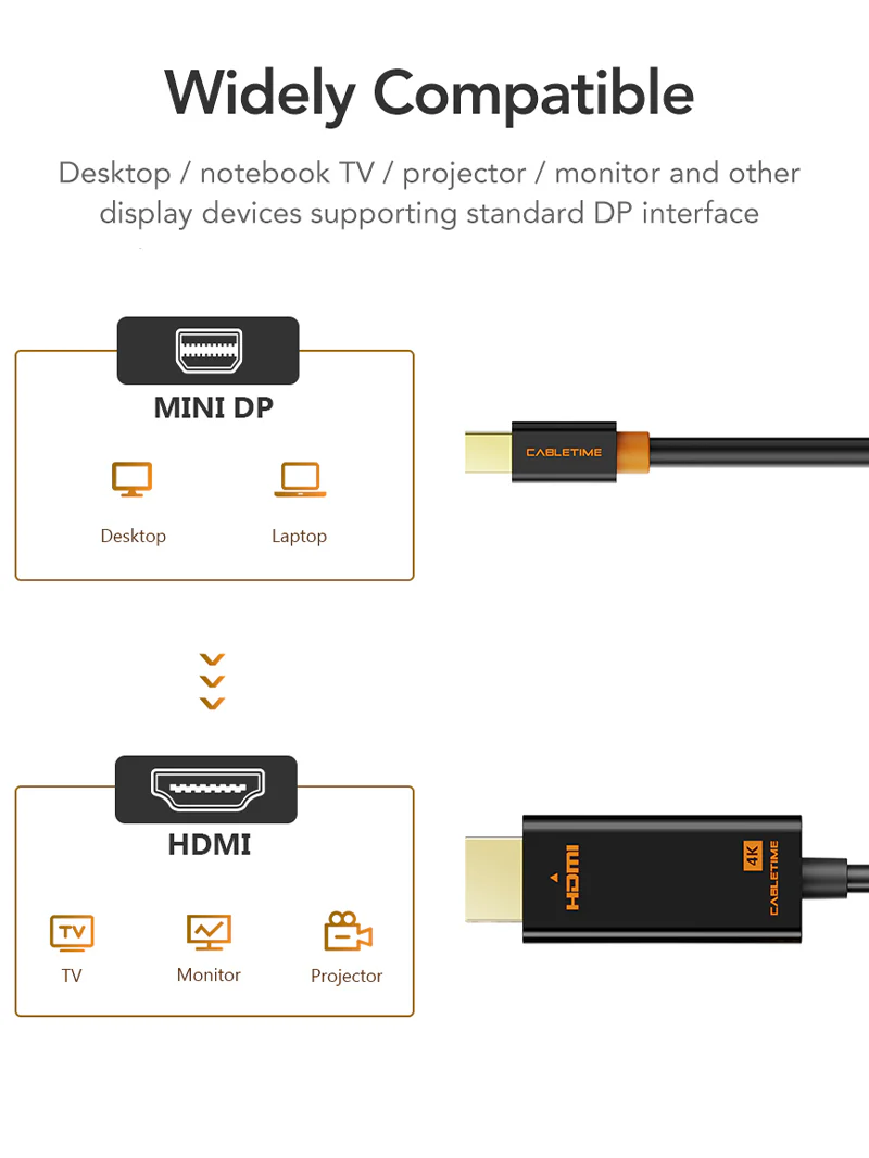 Кабель Mini DP до HDMI обеспечивает ультра-высокое разрешение до 3840 × 2160 при 30 Гц с синхронизированным аудио и видео выводом. Идеально подходит для расширения дисплеев на телевизоры, мониторы или проекторы без задержки.