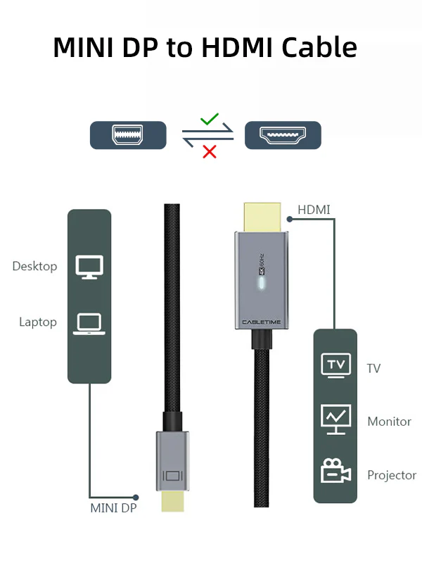 Кабель CABLETIME CD45K (CT-AV588-P03G4K60-SG1.8) TIME Mini DisplayPort - HDMI, Mini DP Male - HDMI Male, Ultra HD 4K/60 Гц, со светодиодом