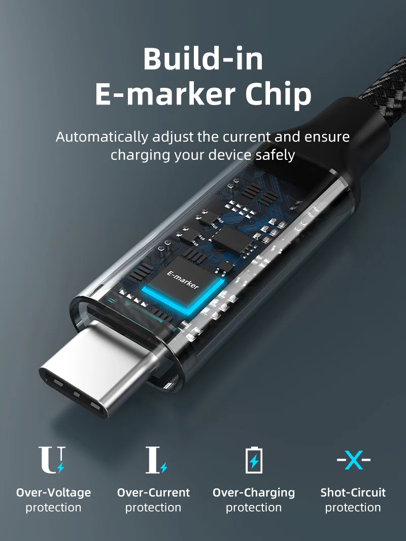 Уделите приоритетное внимание безопасности вашего устройства с помощью нашего зарядного кабеля под углом 90 градусов. Оснащенный усовершенствованным чипом E-marker, он интеллектуально адаптирует ток в соответствии с потребностями вашего устройства. Это не только обеспечивает оптимальную скорость зарядки, но и защищает от потенциальной перезарядки. Так что вы можете быть уверены каждый раз, когда используете его.