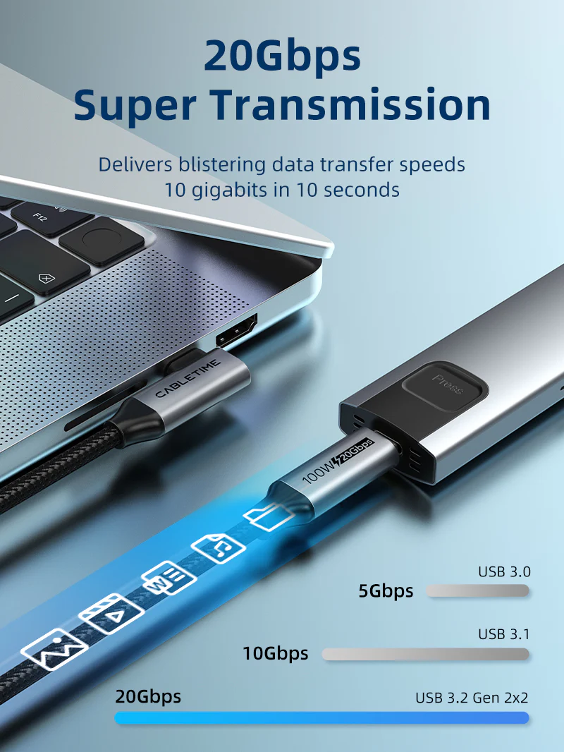Встречайте 90-градусный кабель USB C 3.2 Gen2. CABLETIME. Этот прямоугольный кабель USB C, разработанный для минимизации износа, идеально подходит для труднодоступных портов и обеспечивает долговечность. Заряжайте свой MacBook Air всего за 1,6 часа с помощью мощной выходной мощности 100 Вт, одновременно передавая данные со скоростью 20 Гбит/с и наслаждаясь кристально чистым видеовыпуском 4K. Безопасность имеет первостепенное значение, и наш встроенный чип E-marker обеспечивает безопасную зарядку. Благодаря прочной конструкции с нейлоновой оплеткой этот прямоугольный кабель USB C-USB C легко выдерживает более 10 000 испытаний на изгиб. Кроме того, его многослойное экранирование обеспечивает стабильную и стабильную выходную мощность.