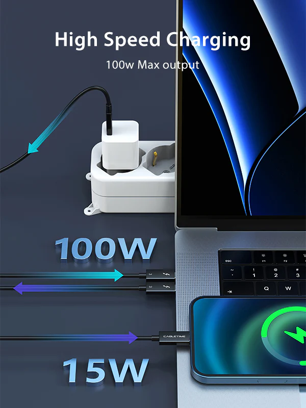 - Питание до 100 Вт: Помимо передачи данных, кабель также способен питать устройства мощностью до 100 Вт, что позволяет использовать его для зарядки ноутбуков, внешних графических карт и других устройств, требующих значительного энергопотребления.