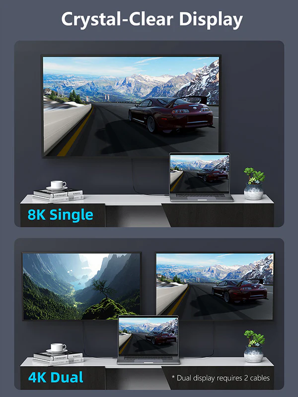 Daisy поддерживает до 6 устройств Thunderbolt, включая док-станции, жесткие диски, внешние видеокарты и дисплеи. Благодаря разрешению видео Ultra HD полоса пропускания 40 Гбит/с позволяет использовать два видео 4K при 60 Гц или один выход 8K при 60 Гц Кабели скорости 40 Гбит/с подходят для сценариев eGPU и двойного дисплея 4K.