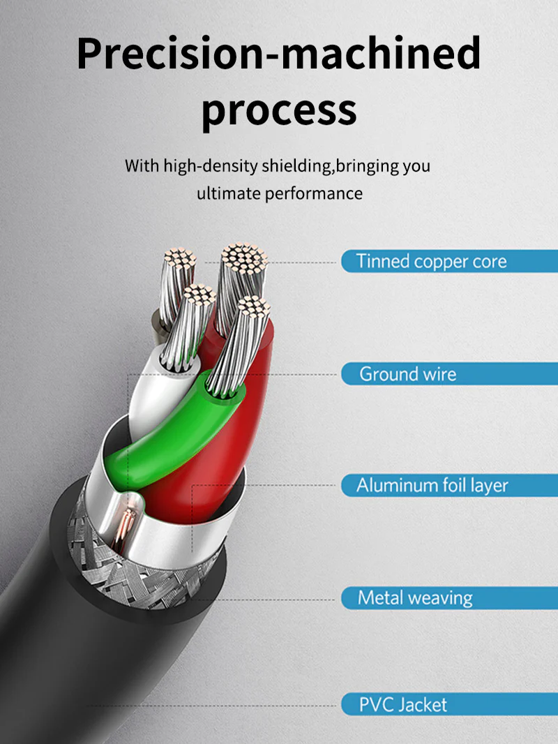 Встроенный резистор 56 кОм, чтобы избежать чрезмерного тока и помочь защитить ваши устройства от повреждений. Экранирование высокой плотности уменьшает помехи сигнала и улучшает характеристики кабеля.