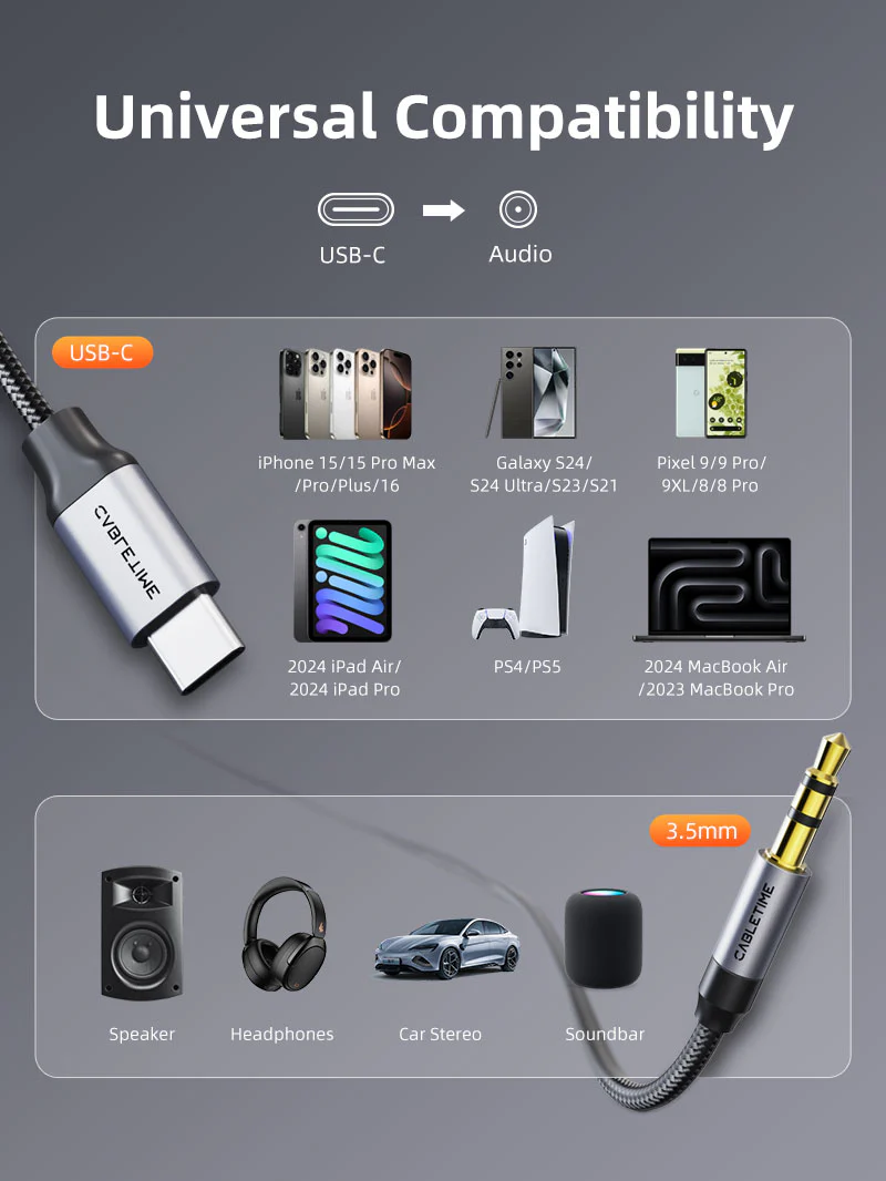 Этот универсальный USB-C-C-3,5-мм кабель работает без проблем с различными устройствами USB-C, включая iPhone, телефоны Android, планшеты и ноутбуки. Это делает подключение ваших устройств с автомобильными стереосистемами, динамиками или наушниками на ветерок, обеспечивая беспрепятственный звук. Будь то дома, на ходу или в машине, вы можете рассчитывать на этот кабель, чтобы каждый раз обеспечить надежные, высококачественные производительность.