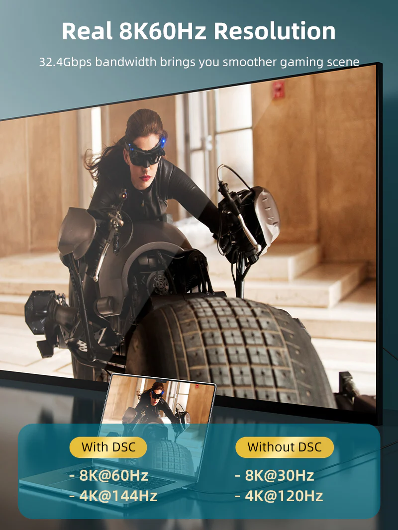 Кабель USB C-DP поддерживает разрешение до 8K 60 Гц, совместим с 4K 144 Гц, 2K 240 Гц. это означает, что вы можете играть в игры с эффектом присутствия, с высокой частотой обновления, чтобы никогда не упустить шанс выиграть. Пропускная способность 32,4 Гбит/с обеспечивает более плавные и реалистичные игровые сценарии.