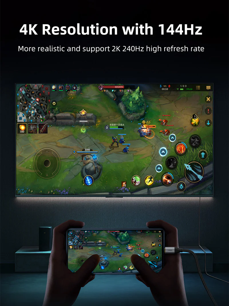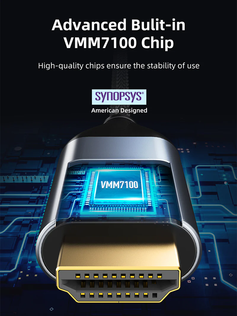 Кабель USB Type C на HDMI 2.1 имеет прочную нейлоновую оплетку, алюминиевый корпус и чип VMM7100, обеспечивающий стабильный сигнал и более длительный срок службы.