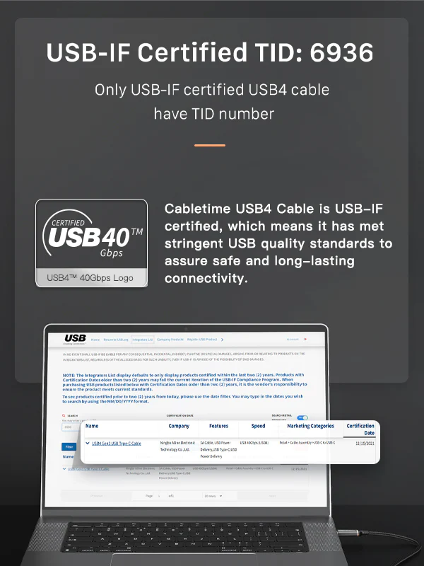 Кабель CABLETIME USB4 сертифицирован, что означает, что он соответствует строгим стандартам качества USB для обеспечения безопасного и длительного подключения.