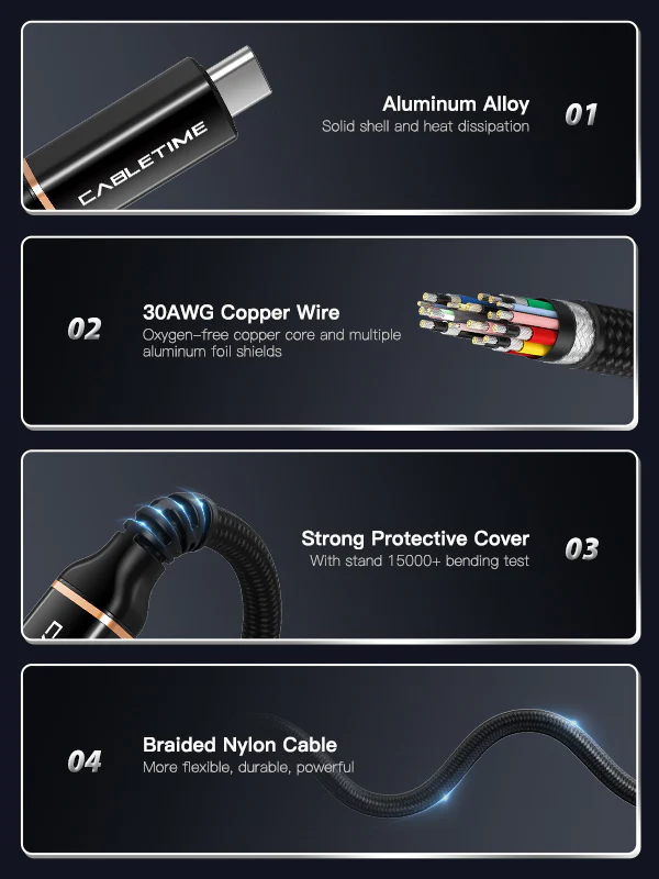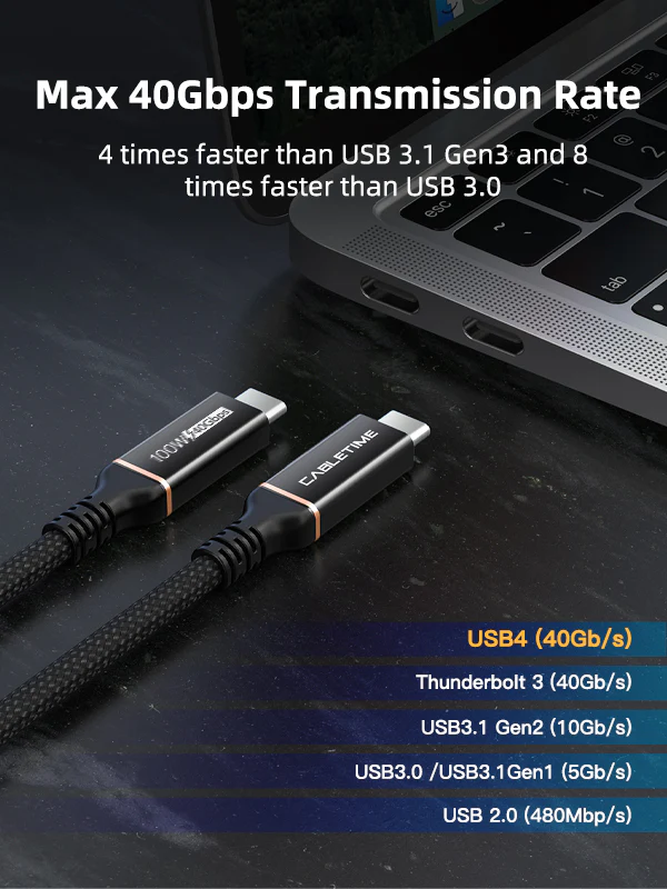 Кабель CABLETIME USB 4 обеспечивает скорость передачи данных 40 Гбит/с, что вдвое больше по сравнению с предыдущим поколением USB 3,2 Gen 2 × 2. Вы можете передавать музыку, фильмы или целые сезоны телешоу за секунды.