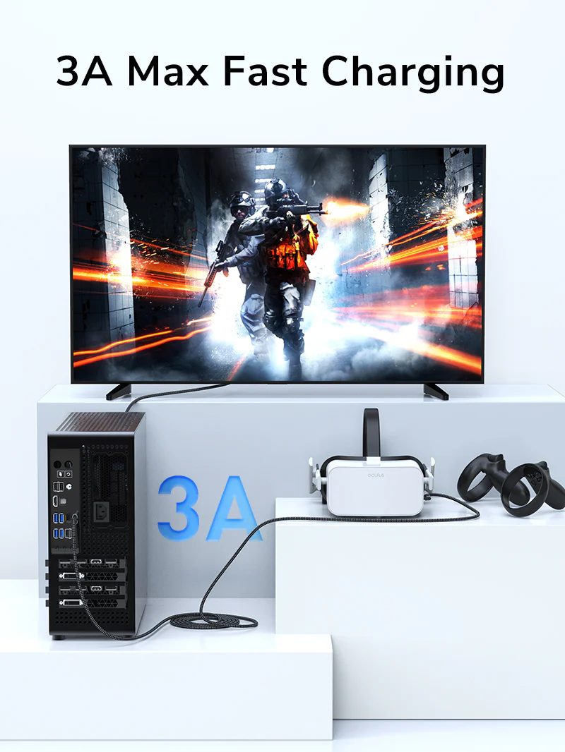 Прямоугольный дизайн идеально подходит для гарнитур виртуальной реальности, легко вставляется и эффективно предотвращает отсоединение во время игры. 10000+ изгибов и нейлоновая оплетка обеспечивают отличные характеристики соединительного кабеля.