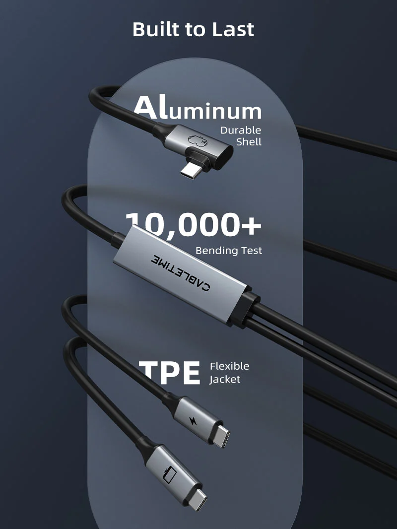 Кабель CABLETIME VR Link разработан для комфорта и долговечности. Его угловой разъём 90° снижает нагрузку на гарнитуру и надёжно фиксирует её даже при интенсивных движениях в виртуальной реальности, а алюминиевый корпус и гибкая оболочка из термопластичного эластомера выдерживают более 10 000 изгибов. Такое сочетание обеспечивает надёжное соединение и долговечность, делая этот кабель идеальным для длительных игровых сессий.