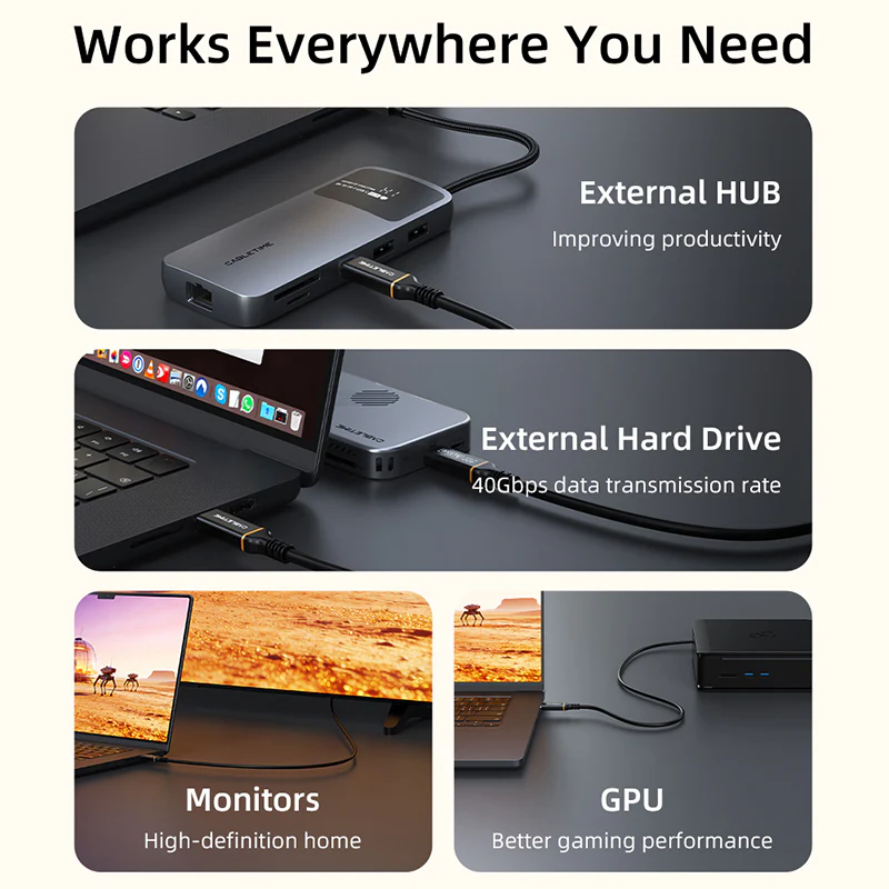 Этот активный кабель USB4 оснащен усовершенствованным чипсетом обработки сигнала, обеспечивающим стабильную работу на полной пропускной способности на увеличенной длине в 3 метра. Он надежно поддерживает передачу данных со скоростью 40 Гбит/с, вывод видео высокого разрешения и подачу питания мощностью до 100 Вт — значительно превосходя ограничения по дальности для пассивных кабелей USB-C, обеспечивая при этом стабильную скорость, стабильность изображения и эффективность зарядки для требовательных конфигураций.