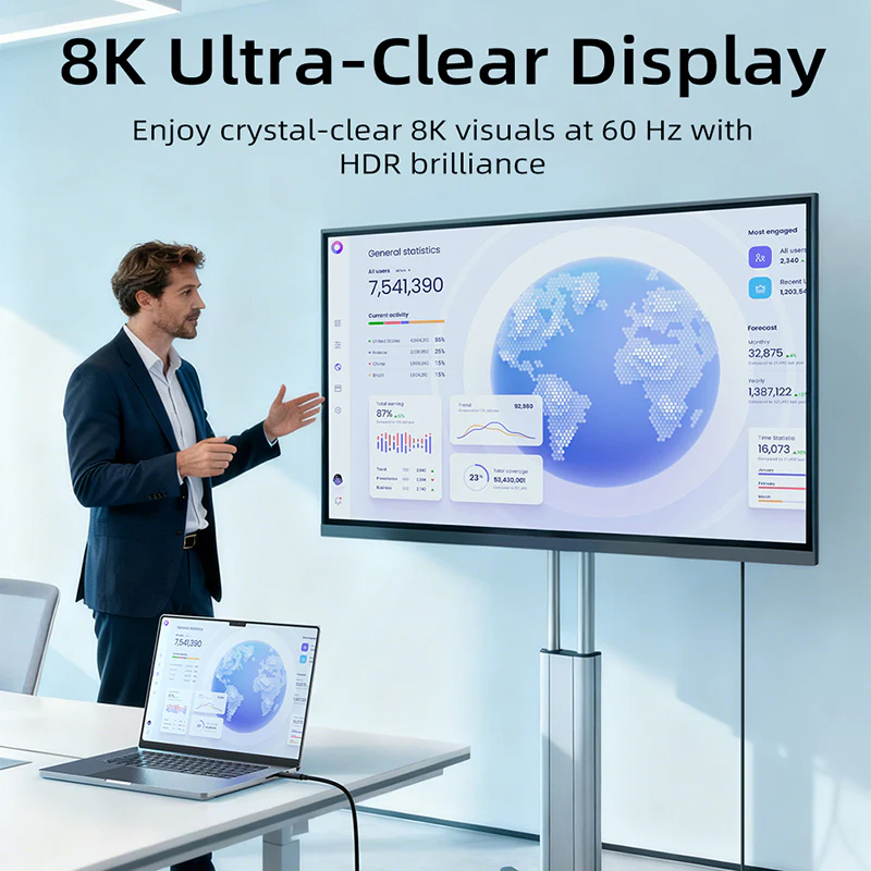 Сверхчеткое изображение 8K: Оцените потрясающую четкость изображения благодаря поддержке разрешения 8K при частоте 60 Гц, обеспечивающей четкую детализацию, плавное движение и реалистичные цвета для профессиональных презентаций и визуальной работы. Этот кабель aoc USB C обеспечивает стабильный выходной сигнал DisplayPort в альтернативном режиме на больших расстояниях, что делает его идеальным для конференц-залов, центров управления, творческих студий и высококлассных дисплеев, где качество и надежность изображения имеют решающее значение для четкой связи и впечатляющего просмотра.