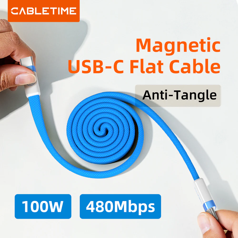 Устали от запутанных кабелей и медленной зарядки? Обновите магнитный плоский кабель CABLETIME USB-C, где инновации сочетаются с практичностью. Это не просто еще один шнур — это электростанция с автоматической намоткой, которая аккуратно сматывается за считанные секунды благодаря встроенной конструкции магнитной спирали. Благодаря плоской конструкции он компактен, не спутывается и в 3 раза меньше традиционных круглых кабелей, поэтому идеально подходит для вашего кармана, автомобиля или дорожной сумки. Испытайте мощность 100 Вт (20 В/5 А), которая питает ноутбуки, планшеты и смартфоны на полной скорости, а также интеллектуальную защиту E-Marker для безопасного и регулируемого питания. Благодаря передаче данных со скоростью 480 Мбит/с вы можете перемещать файлы, фотографии и видео за считанные секунды. Изготовленный из алюминиевого сплава премиум-класса, с медными жилами двойной толщины и плетеной нейлоновой оболочкой, он выдерживает более 20 000 циклов подключения и изгибов на 90° — срок службы намного дольше, чем у обычных кабелей USB-C. Компактный. Быстрый. Разумный. CABLETIME предлагает вам магнитный плоский кабель USB-C, который не просто заряжает — он меняет способ подключения.