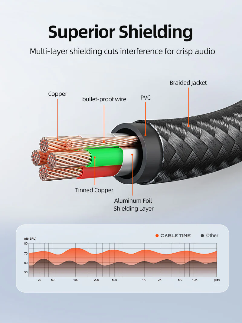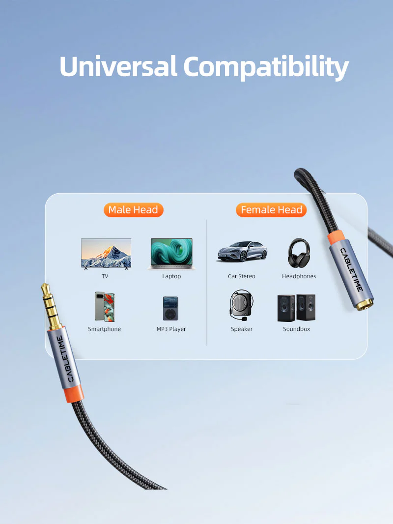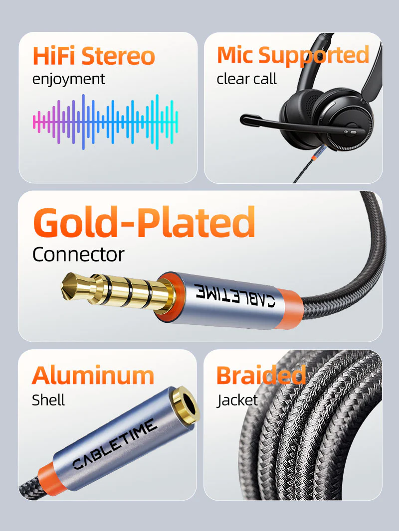 Hi-Fi звук: Удлинительный кабель с аудиоразъемом CABLETIME 3,5 мм «папа-мама» использует 4-полюсную конструкцию TRRS для передачи как стереозвука Hi-Fi, так и сигналов микрофона с нулевым искажением. Благодаря позолоченным 24К разъемам, проводке из бескислородной меди и многослойному экранированию он обеспечивает стабильный и высококачественный звук даже на больших расстояниях. Наслаждайтесь захватывающей музыкой, чистыми голосовыми чатами и плавной потоковой передачей — без жужжания и прерываний.