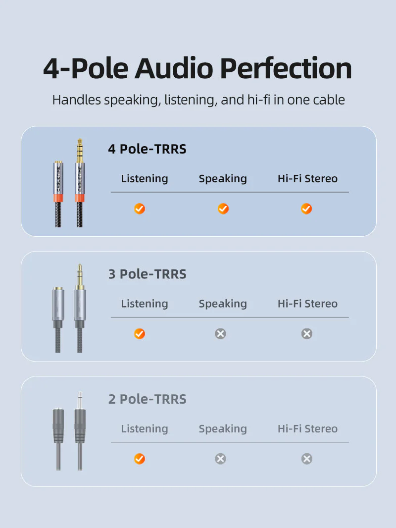 TRRS Design: В отличие от базовых дополнительных удлинителей, этот 4-контактный аудиокабель TRRS поддерживает как стереозвук, так и сигналы микрофона — идеально подходит для голосовых чатов, собраний, онлайн-классов или прямых трансляций. Он сохраняет чистоту вашего голоса и обеспечивает широкополосный звук — и все это благодаря одному простому подключению.