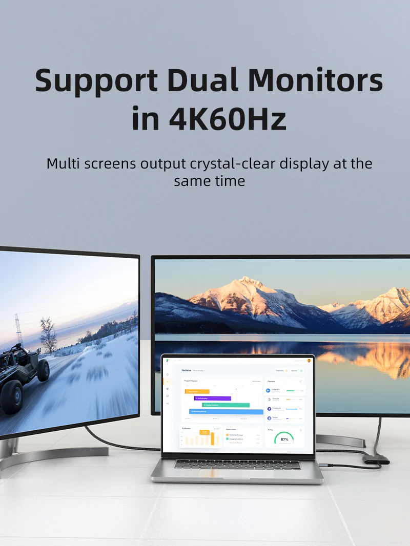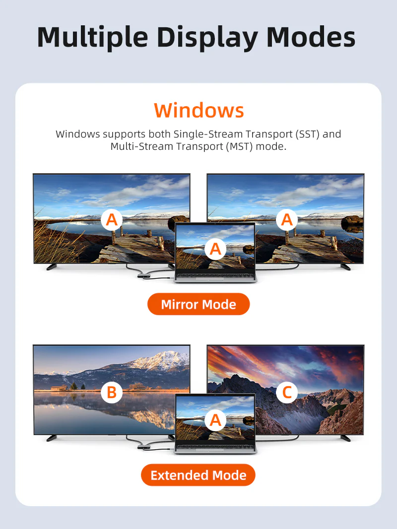 Многоэкранный дисплей: Для пользователей Windows он поддерживает режим многопотоковой передачи (MST), что позволяет расширить дисплей до двух мониторов, что идеально подходит для многозадачности и более эффективного рабочего пространства.