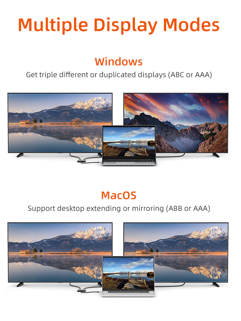 Режим расширения/зеркала: Для систем Windows адаптер поддерживает возможности однопотоковой передачи (SST) и многопотоковой передачи (MST). В режиме зеркалирования или расширения два монитора могут отображать один и тот же контент или разный контент с исходного устройства USB C.