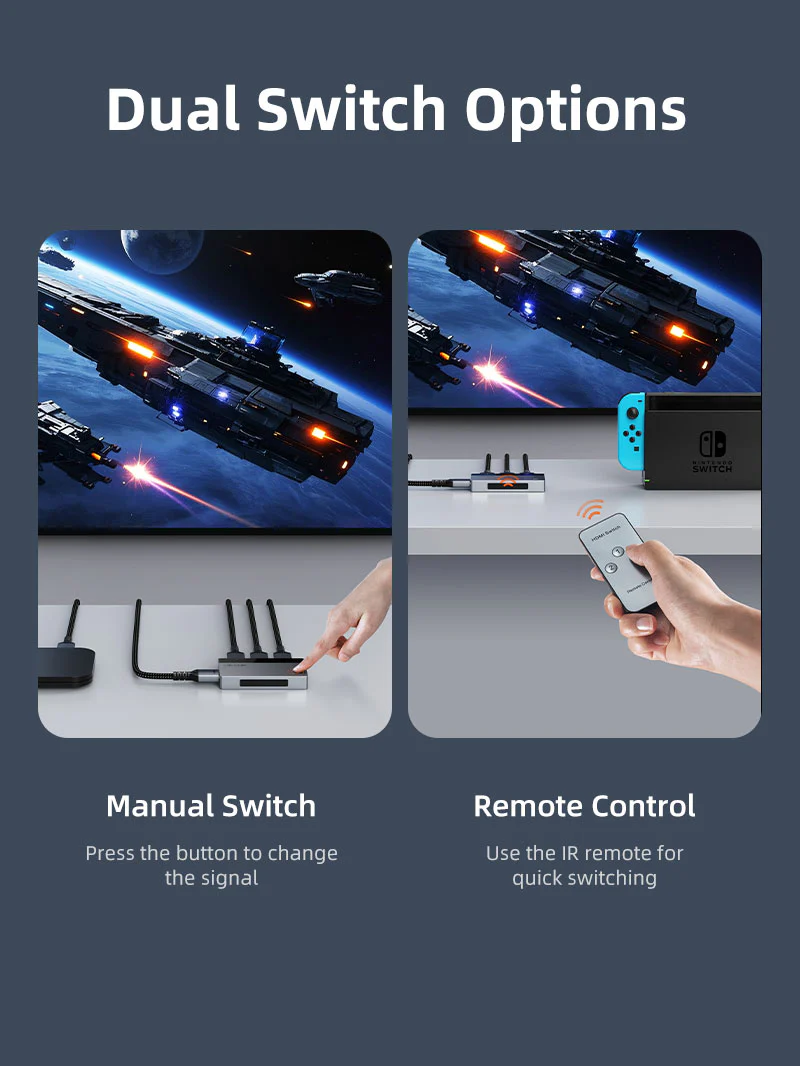 2-позиционный переключатель: Наслаждайтесь максимальной гибкостью с переключением ручного и дистанционного управления. Легко нажмите кнопку, чтобы изменить сигнал, или использовать включенный IR -пульт для быстрого и удобного переключения с комфорта вашего места. Встроенный светодиодный индикатор обеспечивает четкий визуальный сигнал с зеленым светом, показывающим, какой источник HDMI в настоящее время используется. Идеально подходит для бесшовных переходов между устройствами без каких-либо хлопот, что делает вашу настройку более эффективной и удобной для пользователя.