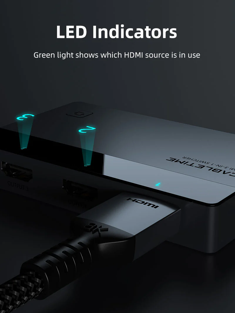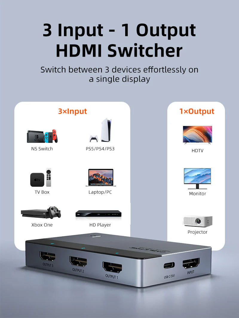 3 в 1 переключатель HDMI: Подключите до трех устройств HDMI, таких как Nintendo Switch, Xbox One, PS5/PS4/PS3, ноутбук/ПК или Blu-ray Player, к одному дисплее. Легко переключитесь между устройствами на HDTV, монитор или проектор. Наслаждайтесь чистящим разрешением 4K 60 Гц без необходимости обменять кабели и управлять устройствами, используя удаленную или ручную кнопку. Идеально подходит для игр, работы и развлечений.
