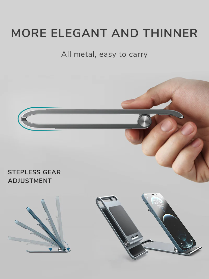 Благодаря полностью складным и портативным функциям подставка для телефона легко помещается в карманах и небольших сумках, что делает ее идеальным спутником в путешествии, доме и офисе. Минималистичный дизайн и изысканное качество изготовления превращают его в идеальный настольный аксессуар.
