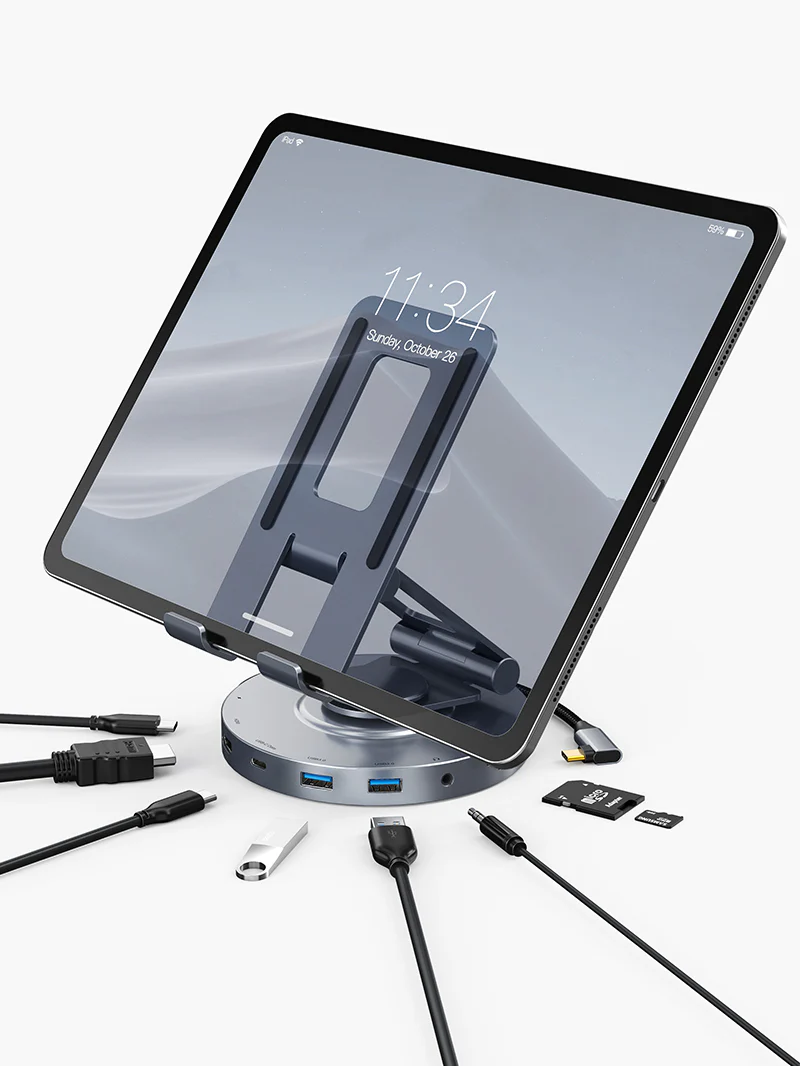 Оснащенный портом HDMI 4K 60 Гц, двумя портами USB 3.0 5 Гбит/с, одним портом USB C 3.0 5 Гбит/с, слотом для карт SD/TF, портом USB C мощностью 100 Вт и аудиопортом 3,5 мм, концентратор и подставка USB CABLETIME могут легко превратить ваш iPad Pro в мощную рабочую станцию. Высоту и угол наклона подставки можно свободно регулировать в соответствии с вашим удобным положением. Складная конструкция позволяет брать его с собой куда угодно. Современный алюминиевый корпус идеально дополняет ваш iPad Pro.