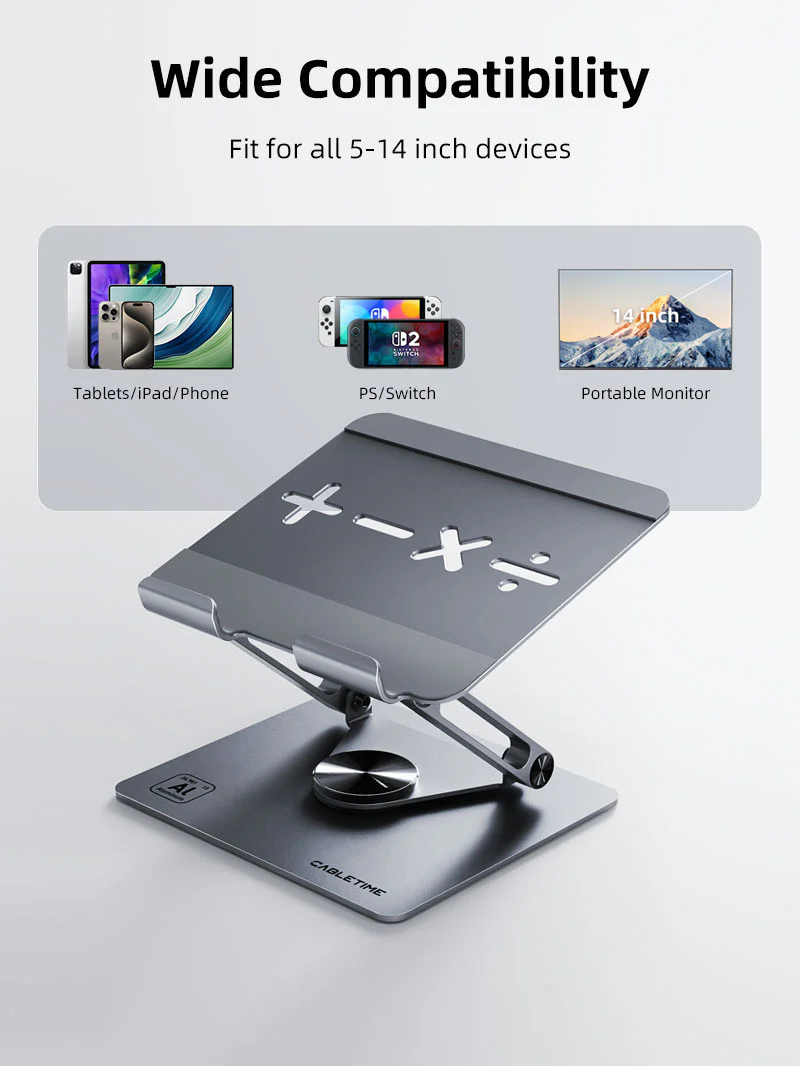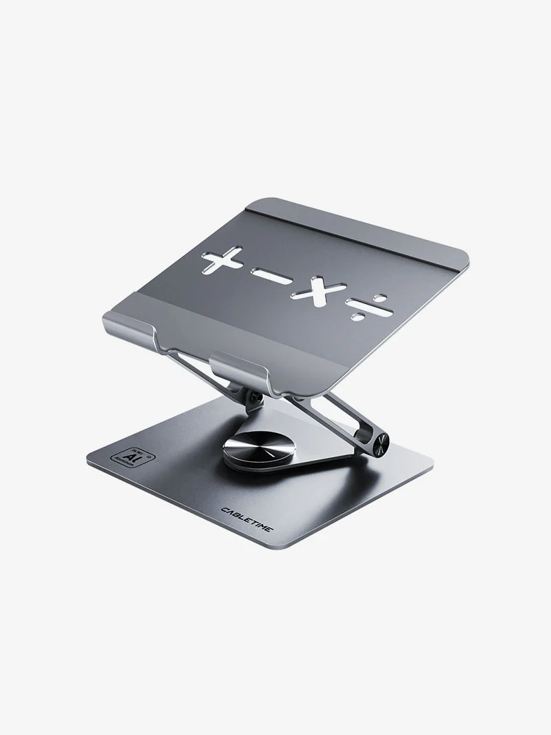 Преобразовать свое рабочее пространство с помощью подставки для ноутбука с регулируемой высотой CableTime. Созданный из прочного алюминия с гладкой анодированной отделкой, он поддерживает ноутбуки от 14 до 17,3 дюйма. При регулировке высоты от 4 см до 20 см вы можете настроить его для оптимального комфорта и улучшения осанки, уменьшения деформации шеи и спины. Его открытый дизайн способствует превосходному воздушному потоку, чтобы ваш ноутбук прохлался во время расширенного использования. Компактная и складываемая, эта легкая подставка (весом всего 720 г) идеально подходит для домашних, офисных или настройки. Силикагель против скольжения обеспечивает стабильность и предотвращает царапины, в то время как его современный минималистский дизайн добавляет оттенка элегантности к любому столу.