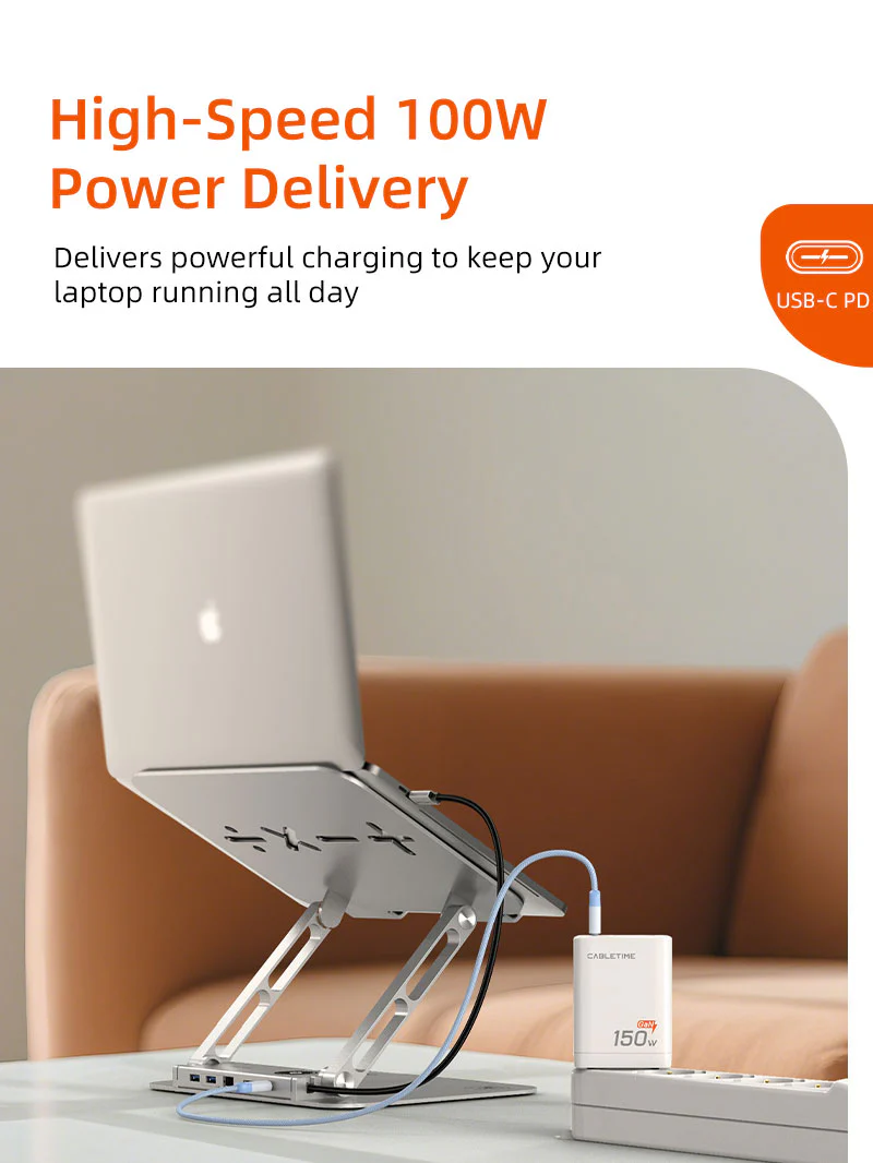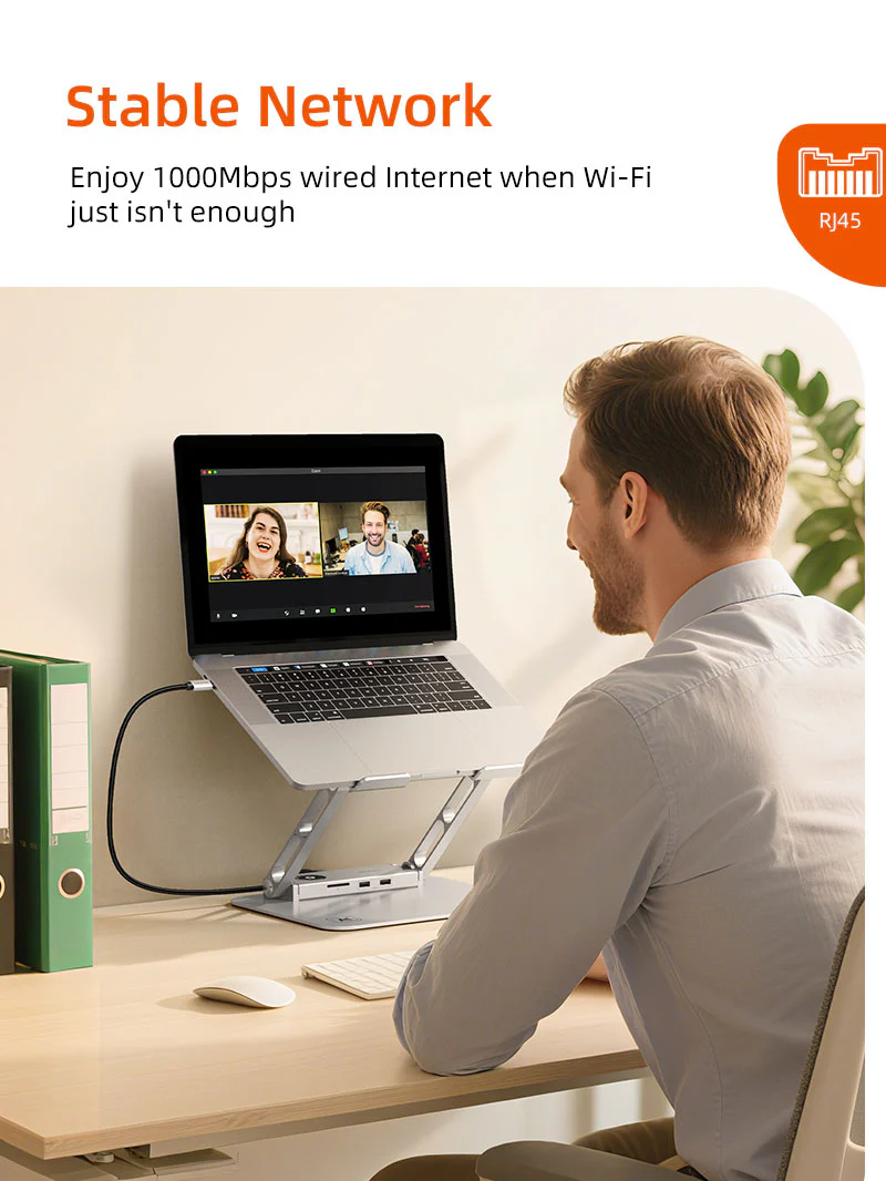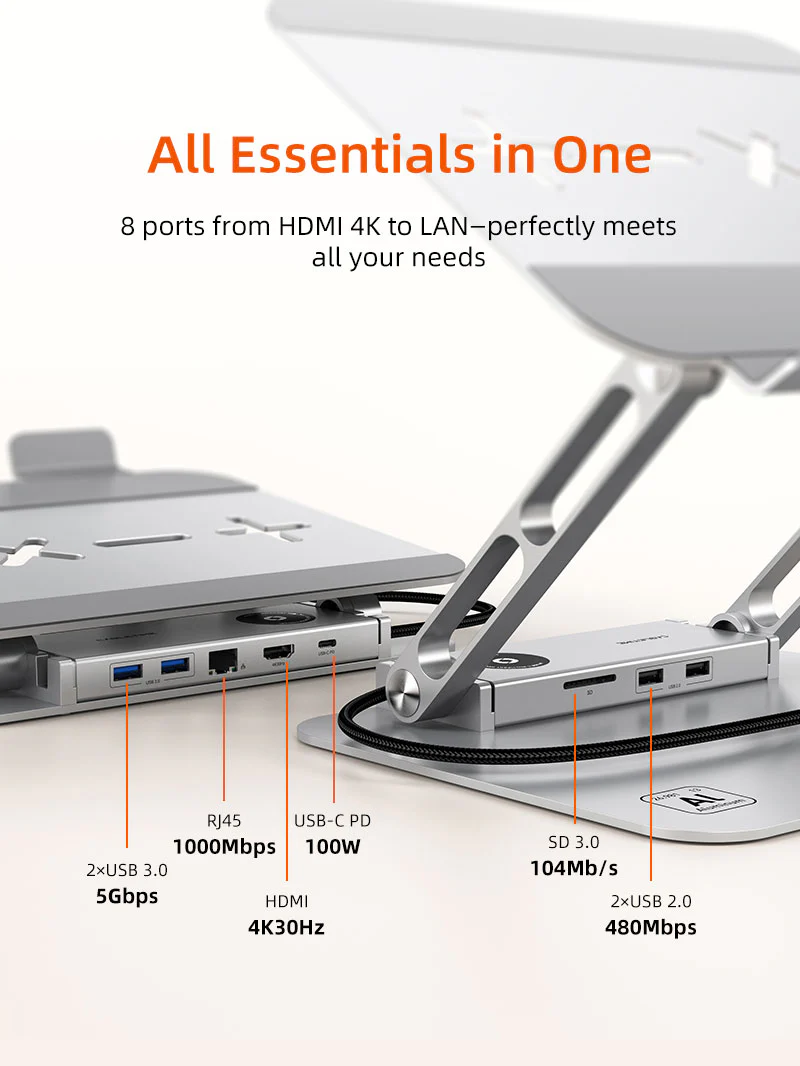 Док-станция для ноутбука 8 в 1: Эта подставка для док-станции для ноутбука объединяет 8 универсальных портов в одном элегантном концентраторе, удовлетворяющем все ваши потребности в подключении. Наслаждайтесь плавным дисплеем 4K HDMI с частотой 30 Гц, сверхбыстрым Ethernet 1000 Мбит/с и зарядкой USB-C PD мощностью 100 Вт, чтобы ваш ноутбук оставался под напряжением во время ресурсоемких задач. Благодаря двум портам USB 3.0 для передачи данных со скоростью 5 Гбит/с, слоту SD 3.0 со скоростью 104 МБ/с и портам USB 2.0 для периферийных устройств вы можете легко подключать дисплеи, сети, хранилища и аксессуары, не загромождая рабочее пространство множеством адаптеров.