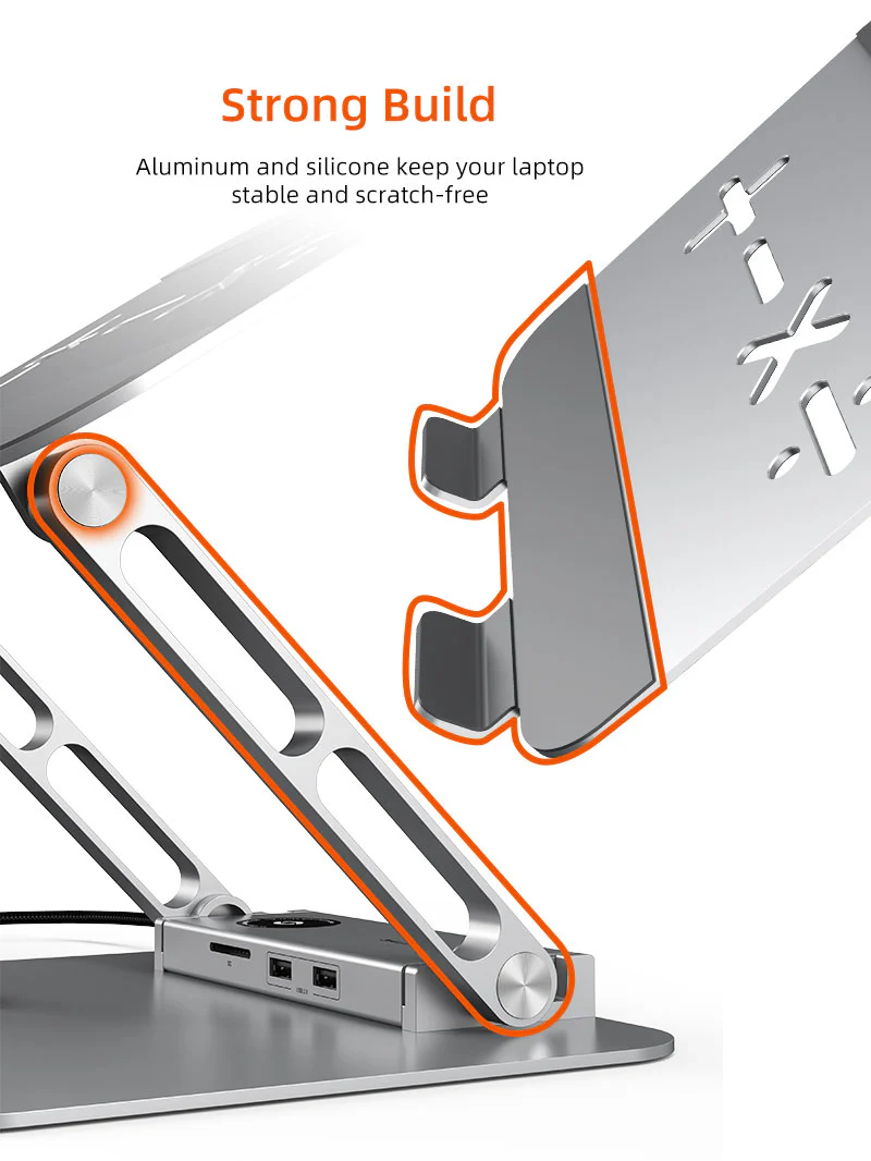 Прочная конструкция: Эта подставка для ноутбука и док-станции, изготовленная из высококачественного алюминиевого сплава, поддерживает ноутбуки с диагональю до 17,3 дюйма и обеспечивает исключительную устойчивость — без раскачивания и подпрыгивания. Силиконовые накладки на основании и краях надежно удерживают устройство на месте и предотвращают появление царапин. Независимо от того, печатаете ли вы, проектируете или играете, ваш ноутбук остается безопасным, устойчивым и готовым к максимальной производительности.