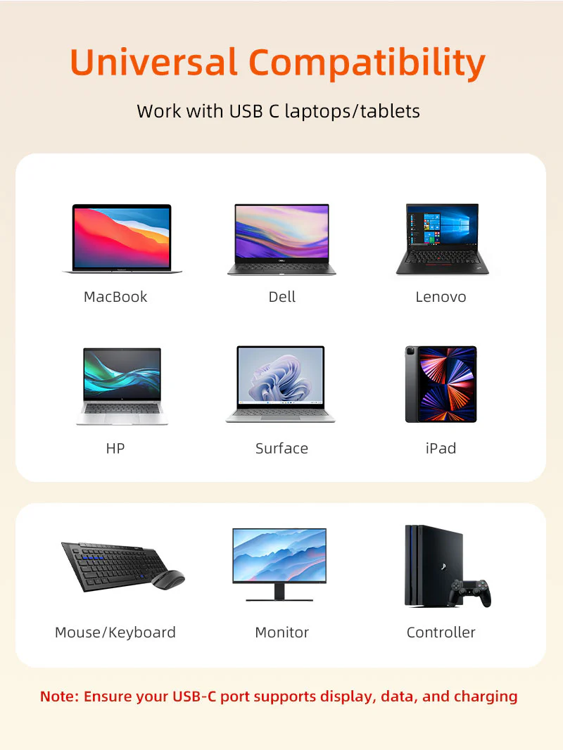 Зарядка мощностью 100 Вт & Быстрый Ethernet: Благодаря выделенному порту USB-C PD эта док-станция для ноутбука обеспечивает входную мощность до 100 Вт, гарантируя, что ваш MacBook или ноутбук USB-C останется заряженным даже во время интенсивных задач. Встроенный порт Gigabit Ethernet поддерживает скорость до 1000 Мбит/с, обеспечивая стабильное проводное соединение, которое превосходит Wi-Fi для бесперебойной видеоконференцсвязи, загрузки файлов и совместной работы в Интернете.