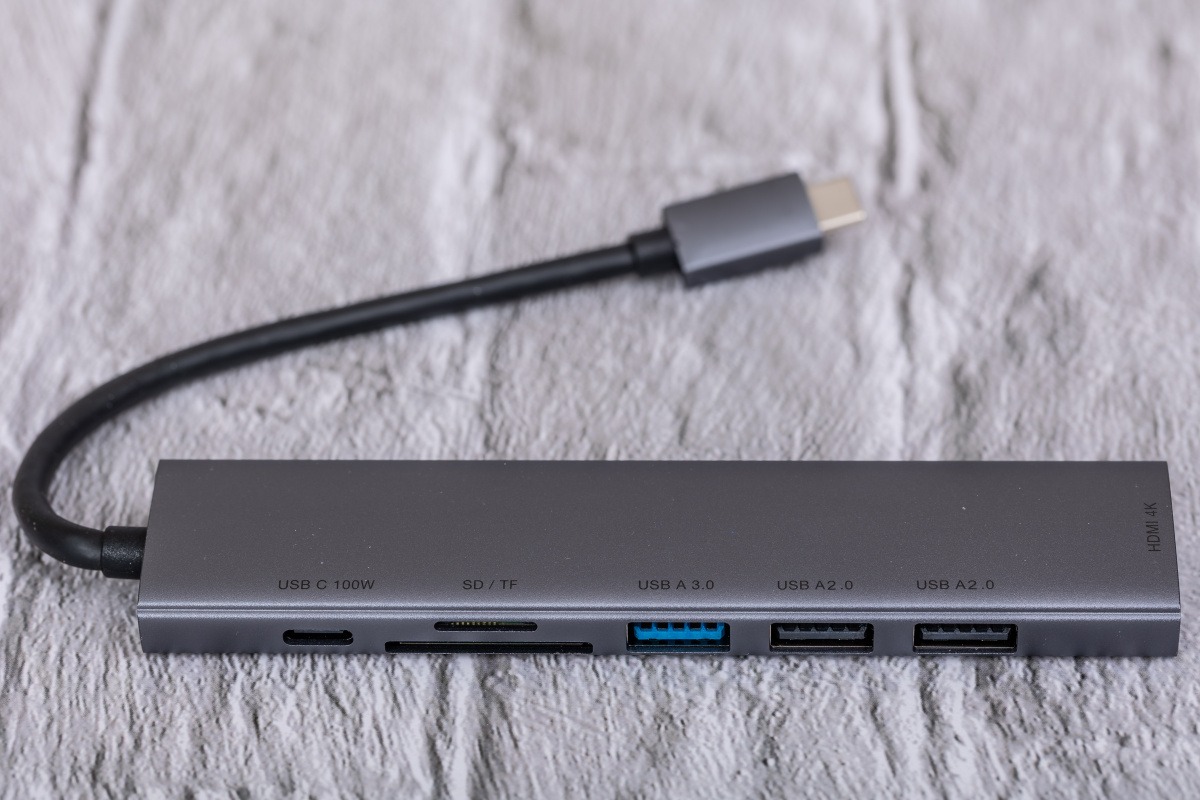 Концентратор USB C на 7 портов: Повысьте универсальность своего ноутбука с помощью нашего концентратора USB-C на 7 портов, оснащенного входом USB-C для бесперебойного подключения. Он включает порт HDMI 4K30 Гц, порт USB A 3.0 для быстрой передачи файлов со скоростью 5 Гбит/с, два порта USB A 2.0 для дополнительных устройств, слоты для карт SF/TF 2.0 для быстрого доступа к данным и порт USB C PD мощностью 100 Вт для эффективной зарядки. Все необходимые соединения в одном тонком концентраторе.
