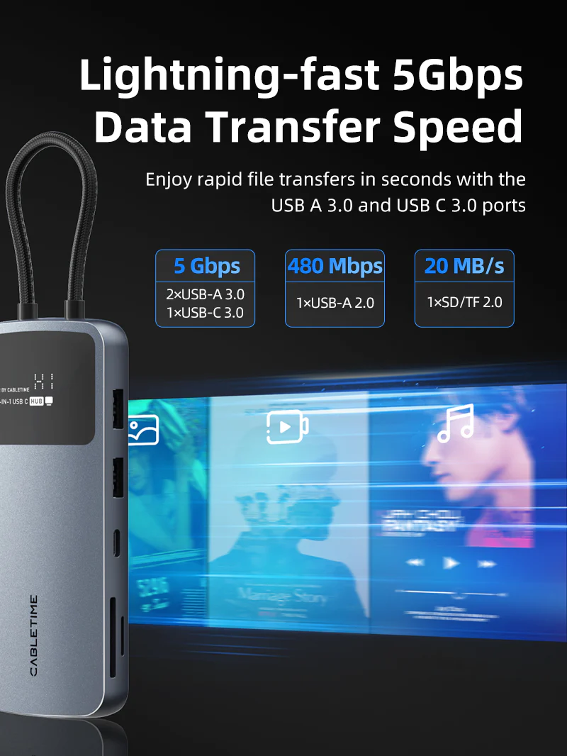 Концентратор Cabletime USB C для ноутбуков оснащен 10 портами, которые удовлетворят все ваши потребности. Порт HDMI 4K, 2 порта USB-A 3.0, порт USB-C 3.0 5 Гбит/с и 2 порта USB-A 2.0 обеспечивают быструю и универсальную передачу данных. Вы также можете получить доступ как к порту SD/TF 2.0, так и к порту USB-C PD, способному заряжать до 100 Вт. Наконец, удобный порт LAN 1000 Мбит/с и аудио/микрофонный порт 3,5 мм обеспечивают дополнительное подключение. Сделайте свой ноутбук универсальным магазином с этим комплексным концентратором.