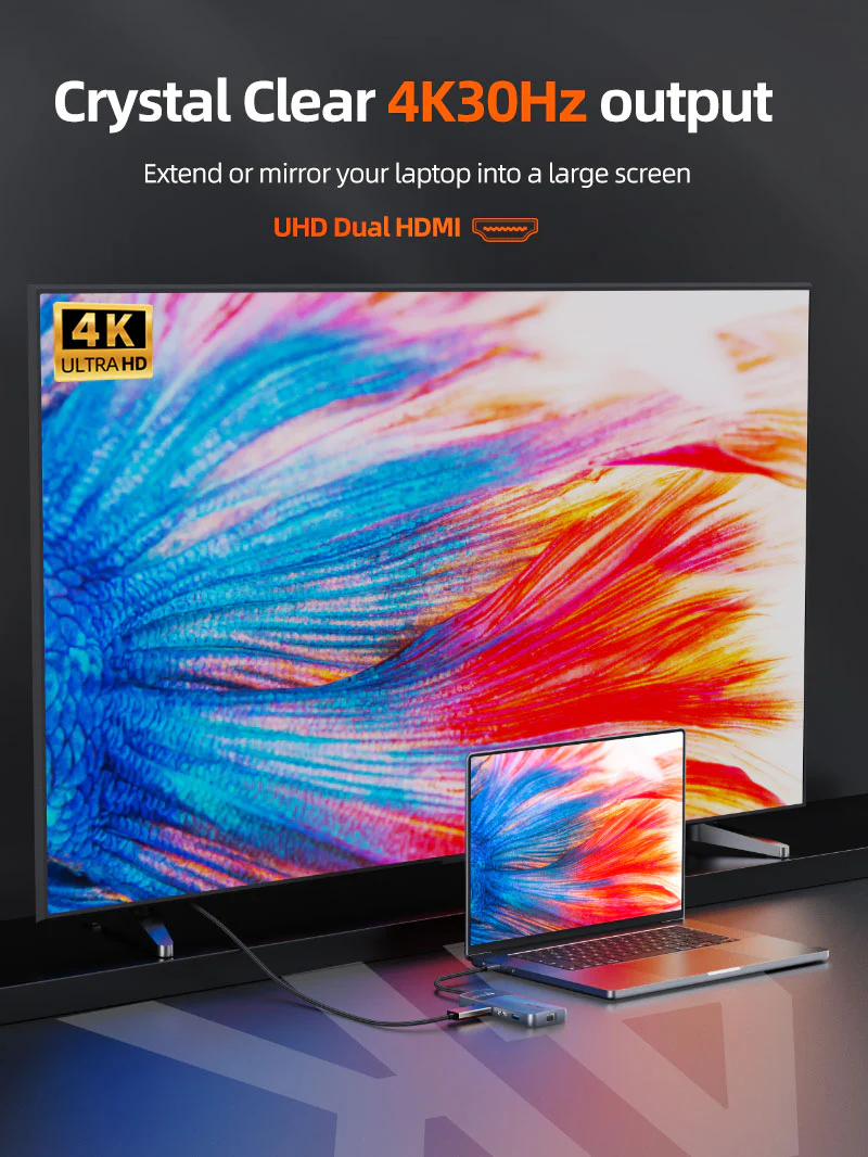 Док-станция CABLETIME 10 в 1 USB C Dual HDMI поможет вам максимально эффективно использовать ваш ноутбук благодаря широкому выбору портов, превращая ваш ноутбук в мощную рабочую станцию с двумя мониторами. Подключите до двух дисплеев 4K HDMI, два порта USB-A 3.0 5 Гбит/с, один порт USB-C 3.0 5 Гбит/с, один порт USB-A 2.0, порт SD/TF 2.0, порт USB-C PD 100 Вт и порт LAN 1000 Мбит/с. Кроме того, он дружески поздоровается с вами, когда вы начнете его использовать, а на его цифровом экране отобразятся номера используемых портов. Наслаждайтесь надежной производительностью с этой удобной док-станцией.