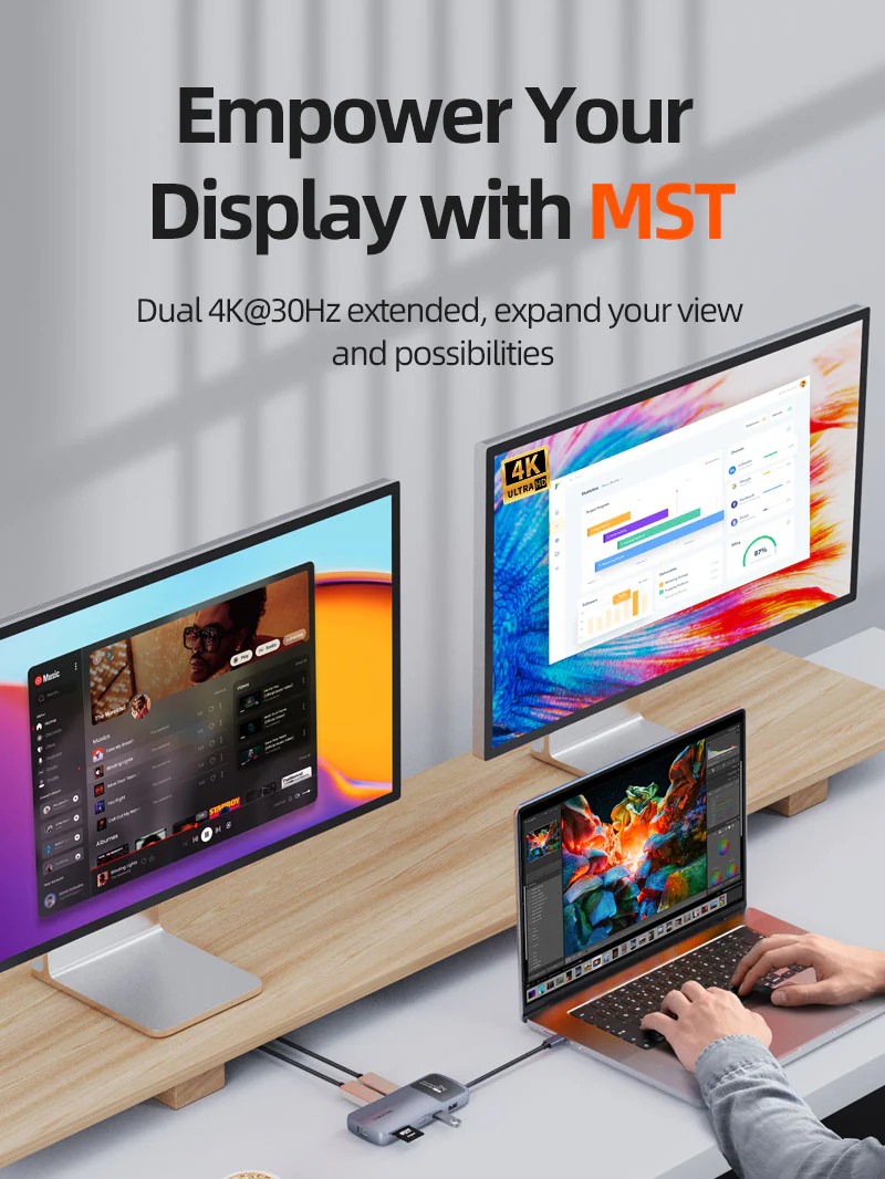Пользователи Mac могут использовать транспорт с одним потоком (SST), чтобы отразить дисплей своего ноутбука на двух мониторах, эффективно дублируя экран для улучшения просмотра и сотрудничества.