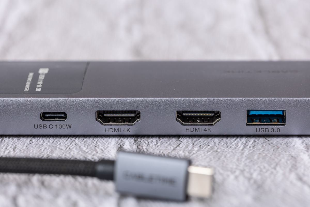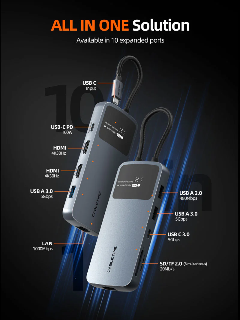Док-станция Cabletime 10 в 1 Dual HDMI USB C-Dock Station-это универсальный магазин подключения для вашей рабочей области. Он имеет два порта HDMI, способные на 4K 30 Гц для двойных дисплеев сверхвысокого определения. Между тем, два порта USB-A 3.0 и один порт USB-C 3.0 обеспечивают быстрые трансферы 5 Гбит / с, в то время как дополнительный USB-A 2.0 может обрабатывать больше периферийных устройств. Двойной считыватель карт SD/TF обеспечивает удобный доступ к хранилищам, устройствам PD USB-C PD Powers с мощностью 100 Вт, а порт LAN обеспечивает быстрый проводной интернет 1000 Мбит/с.