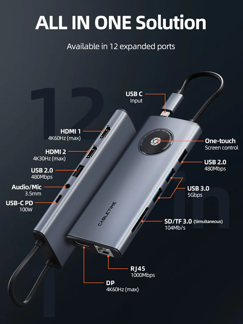 Концентратор USB C 12 в 1: Этот концентратор USB C 12 в 1 предлагает мощное решение для подключения вашей рабочей станции с 1×HDMI 4K60 Гц, 1×HDMI 4K30 Гц, 1×DP 4K60 Гц, 2×USB-A 3.0 5 Гбит/с, 2×USB-A 2.0 480 Мбит/с, 1×SD/TF 3.0, 1×USB-C PD 100 Вт, 1×LAN 1000 Мбит/с и 1×Audio&Mic 3,5 мм. Идеально подходит для работы из дома или в дороге. Приобретите свой сегодня и раскройте весь потенциал своего устройства.