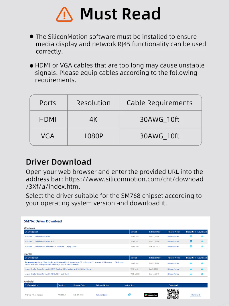 Необходимо установить программное обеспечение SiliconMotion, чтобы обеспечить правильное использование функций отображения мультимедиа и сетевого RJ45.